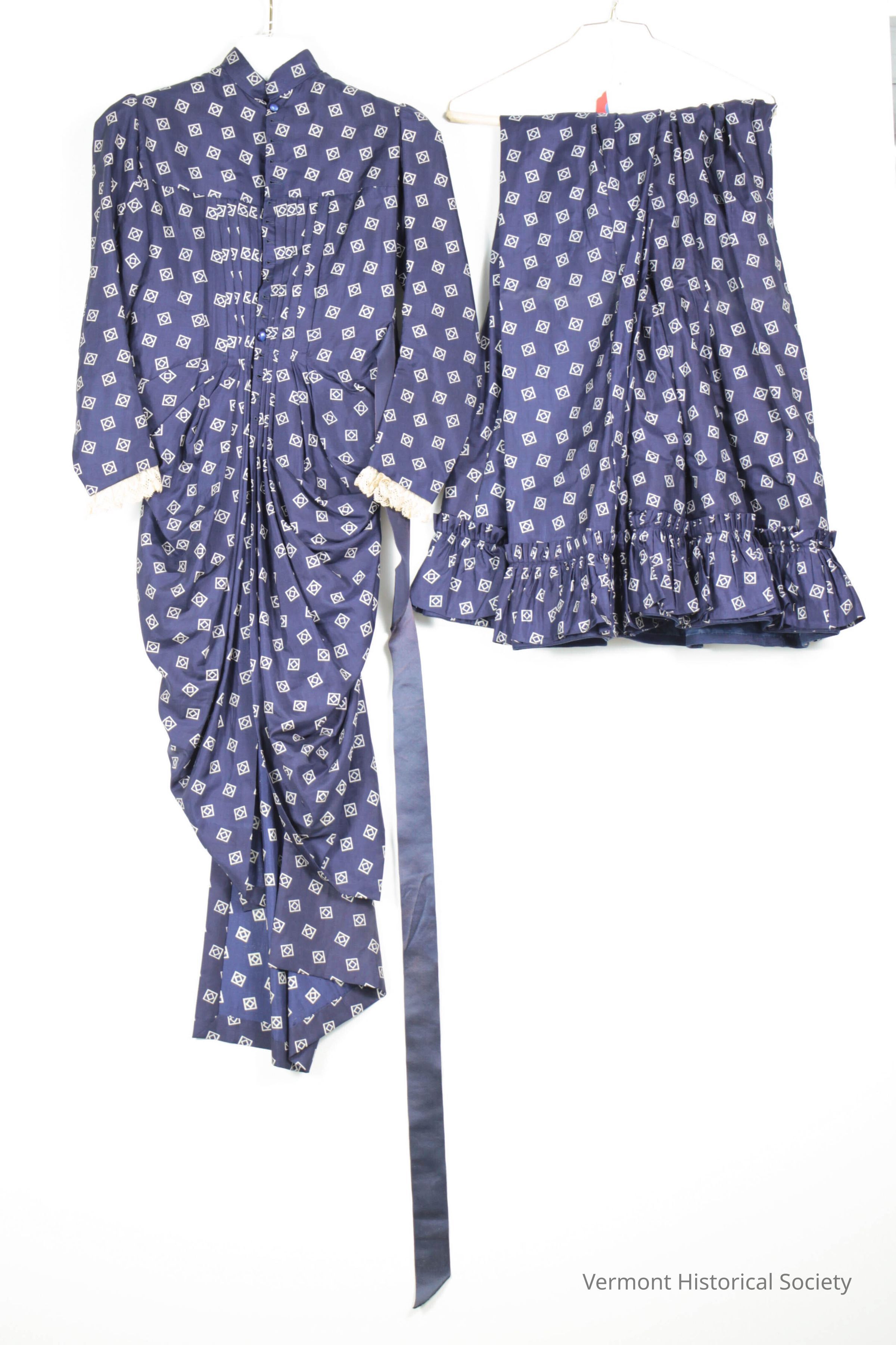 Blue and white silk two-piece dress consisting of a bodice with attached overskirt and skirt. The bodice has long, curve sleeves and opens down the center front, securing with blue post-backed buttons. The high neckline has a standing collar, and the bodice is pleated in knife pleats underneath an upper yolk. It falls into a sort of overskirt, cut in one piece with the front bodice and held in swags at the side. The gored skirt has a self-fabric ruffle at the bottom and an inserted panel of blue cotton at the rear that is covered by the overskirt when worn.Context