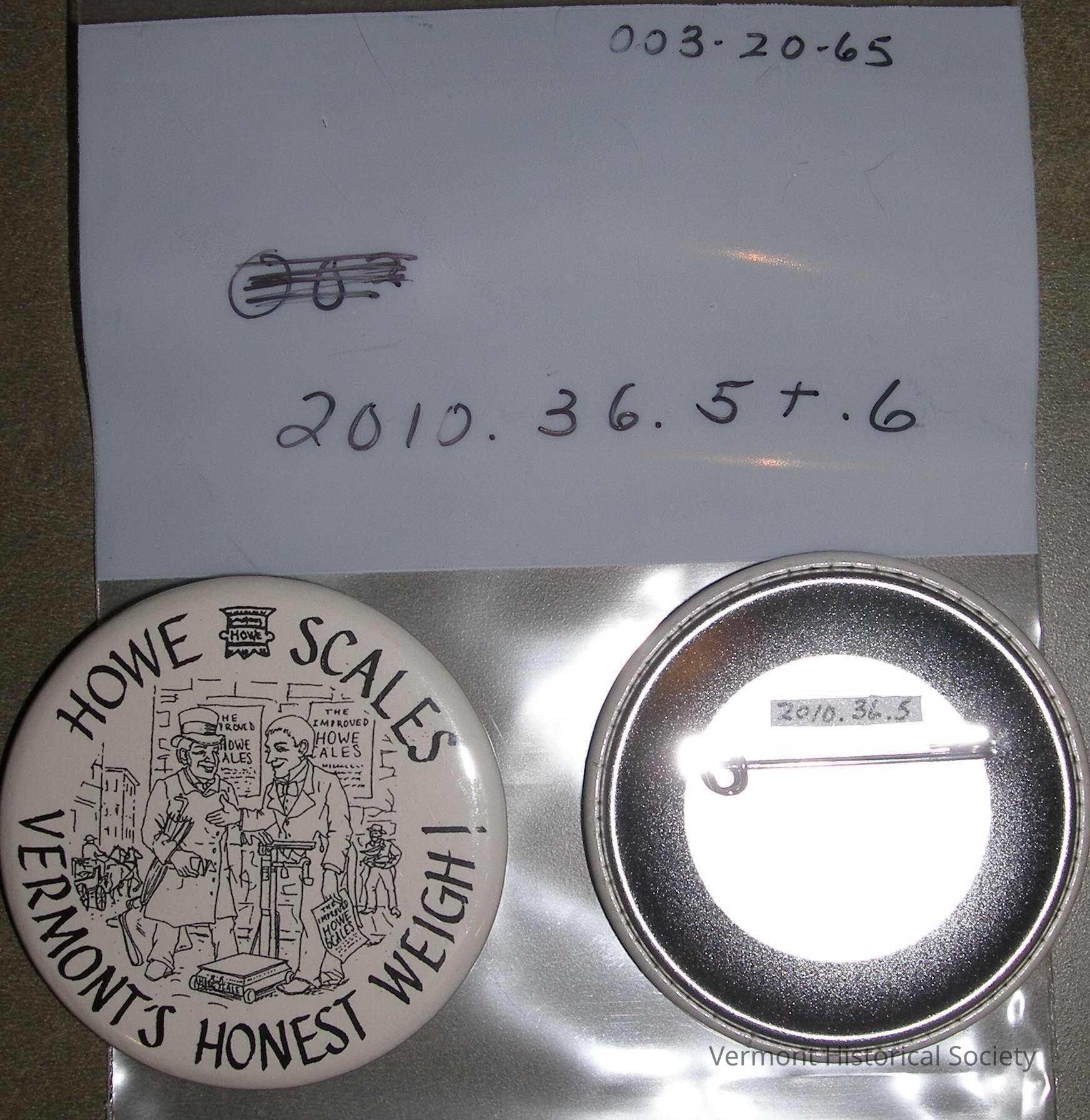 Round white metal button with an illustration of a salesman showing off a large weight scale to another man on a street corner. The words, "HOW SCALES VERMONT'S HONEST WEIGH!", ring the edge.Context