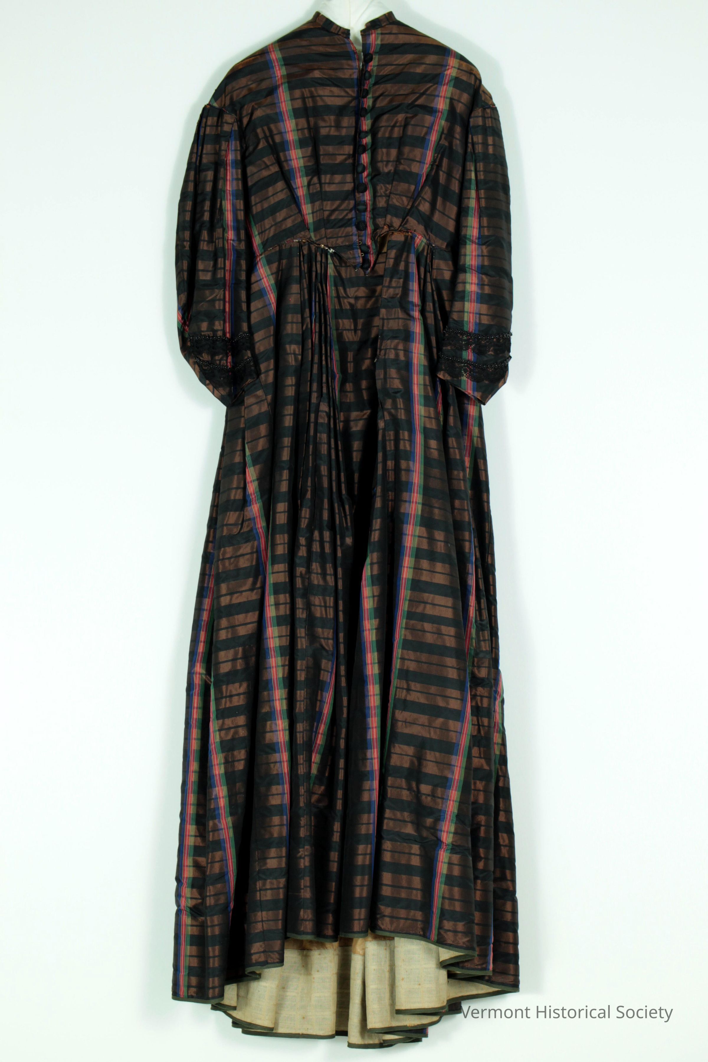 Brown-and-black plaid silk dress. The plain-woven silk is woven into a black-and-brown plaid with prominent black horizontal lines. It is accented with woven vertical stripes of bright blue, red, and green. The bodice of the dress is lightly boned and fitted to the wearer's body with four tucks angled toward the center front. It opens at the center front and secures with hooks and eyes behind a row of black buttons. The dress has a high neckline, curved shoulders, and loosely-cut sleeves that curve slightly near the cuff. The skirt has a slight train and attaches to the bodice with knife pleats. The bottom of the skirt is faced in stiff cotton, and the hem is bound in green wool tape.Context