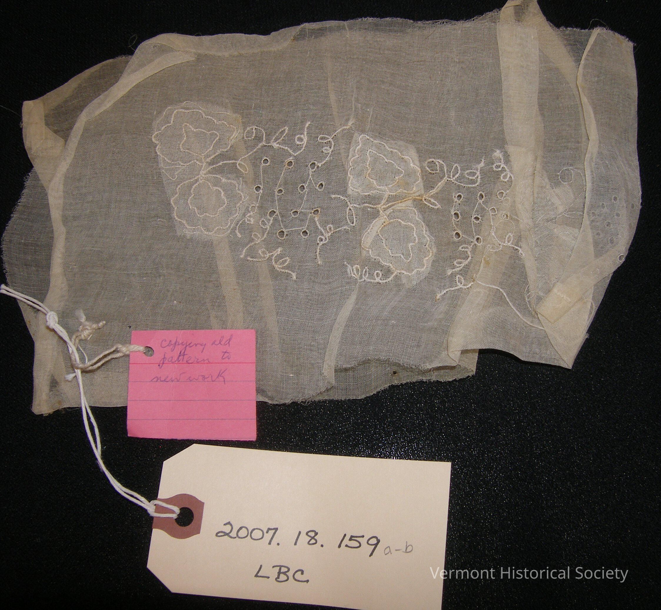 This cloth fragment was given to Lilian Baker Carlisle by Elva Mabel Brownell (1879-1971) of Burlington in 1963. They are examples of copying an old pattern to new work.Acquisition