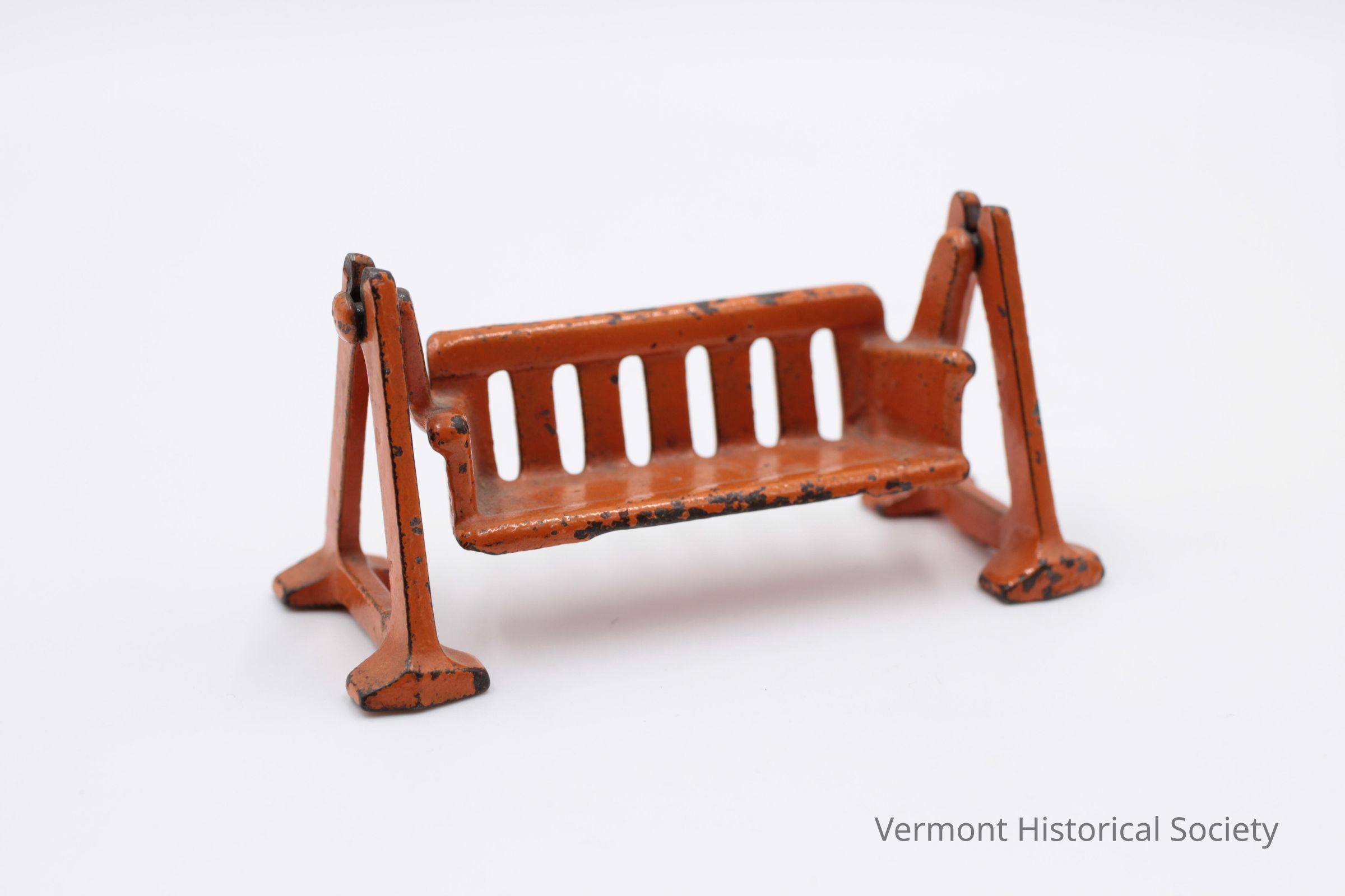Miniature garden swing sized for a dollhouse. The swing consists of two triangular supports on either side of a bench. The bench hangs from the top of the supports.Context