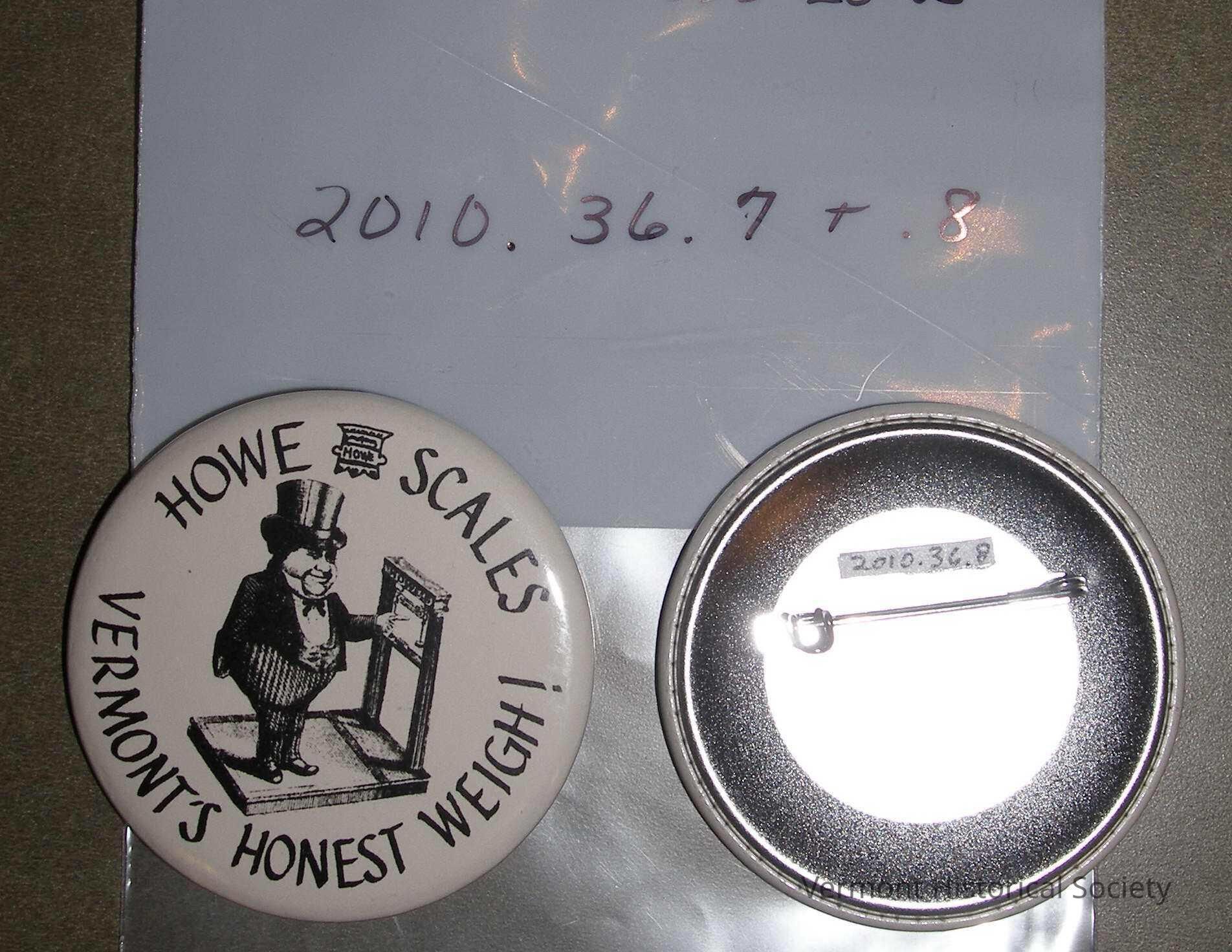 Round white metal button showing a caricature of a rotund man in a top hat standing on a large weight scale with the words, "HOWE SCALES VERMONT'S HONEST WEIGH!" around the edge.Context