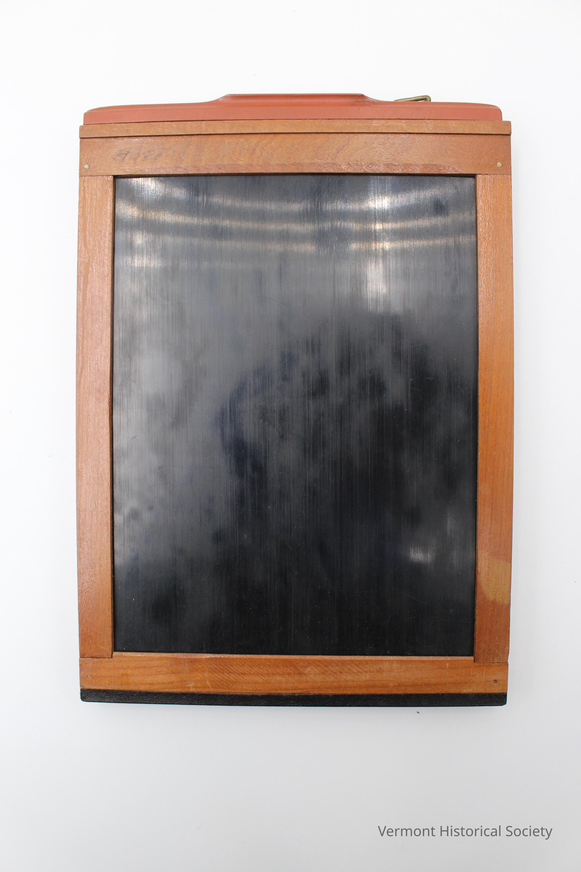 6 glass plate negatives in their sleeves, presumably undeveloped. Each sleeve consists of a wooden frame with a leather hinge on the bottom, similar to a bookbinding. The center part of one side is black-dyed wood or cardstock, while the other is black mica. The mica side attaches to a wooden handle that spans the width of the frame in order to be pulled up to expose the glass plate to light. The handle is held in place by a t-pin to prevent accidental exposure. The pin can be twisted when the user is ready to expose the plates. The top of either side of each frame is marked in pencil with "Portrait No. " and numbered 1-12. The inscription, "ROCHESTER OPTICAL CO./ROCHESTER, N.Y." is pressed into the side of each frame.Context