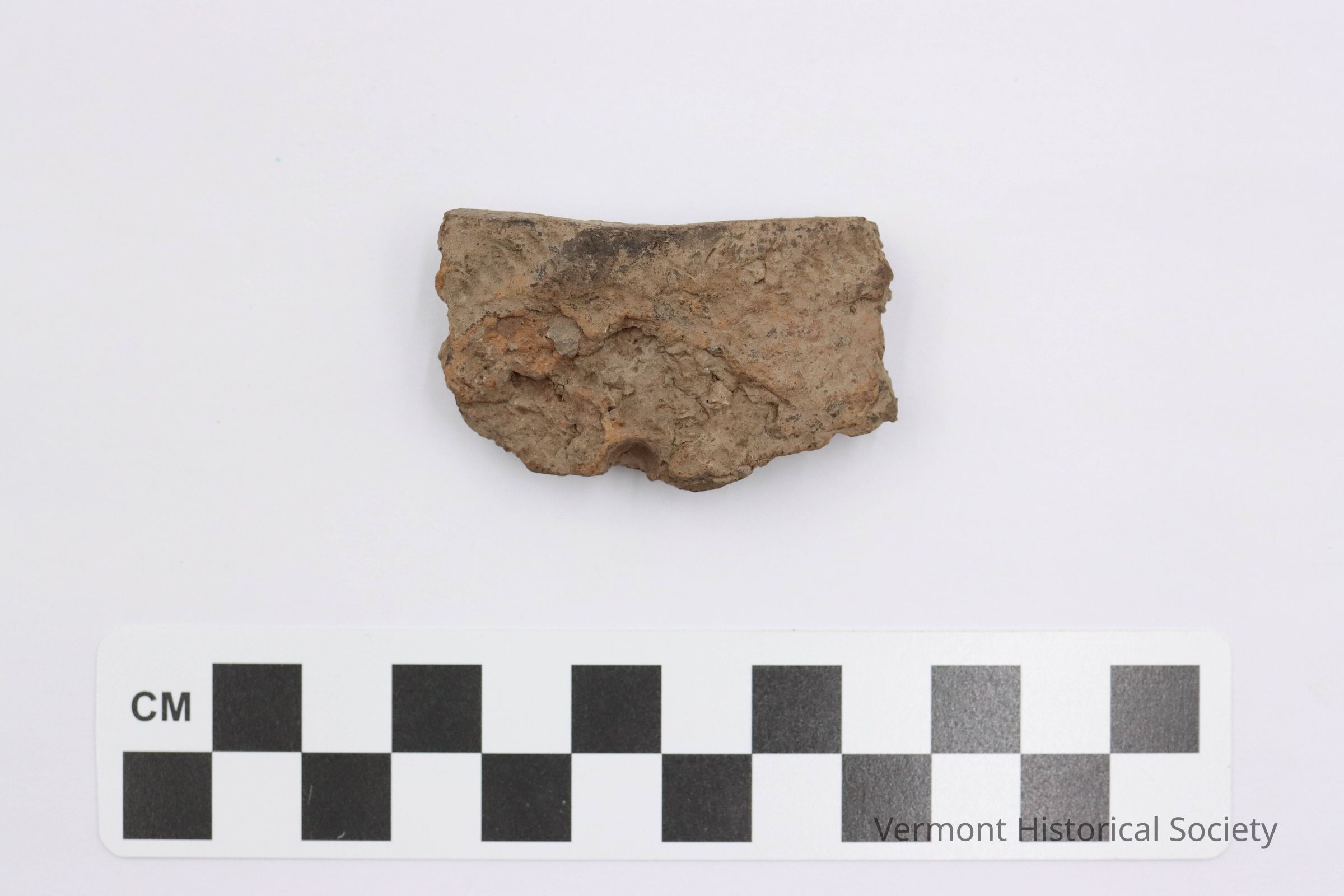 Pottery rim sherd with linear corded decoration. There are oblique rows of linear cording with circular punctate below. The rim is slightly excurvate, and it has a rounded lip.