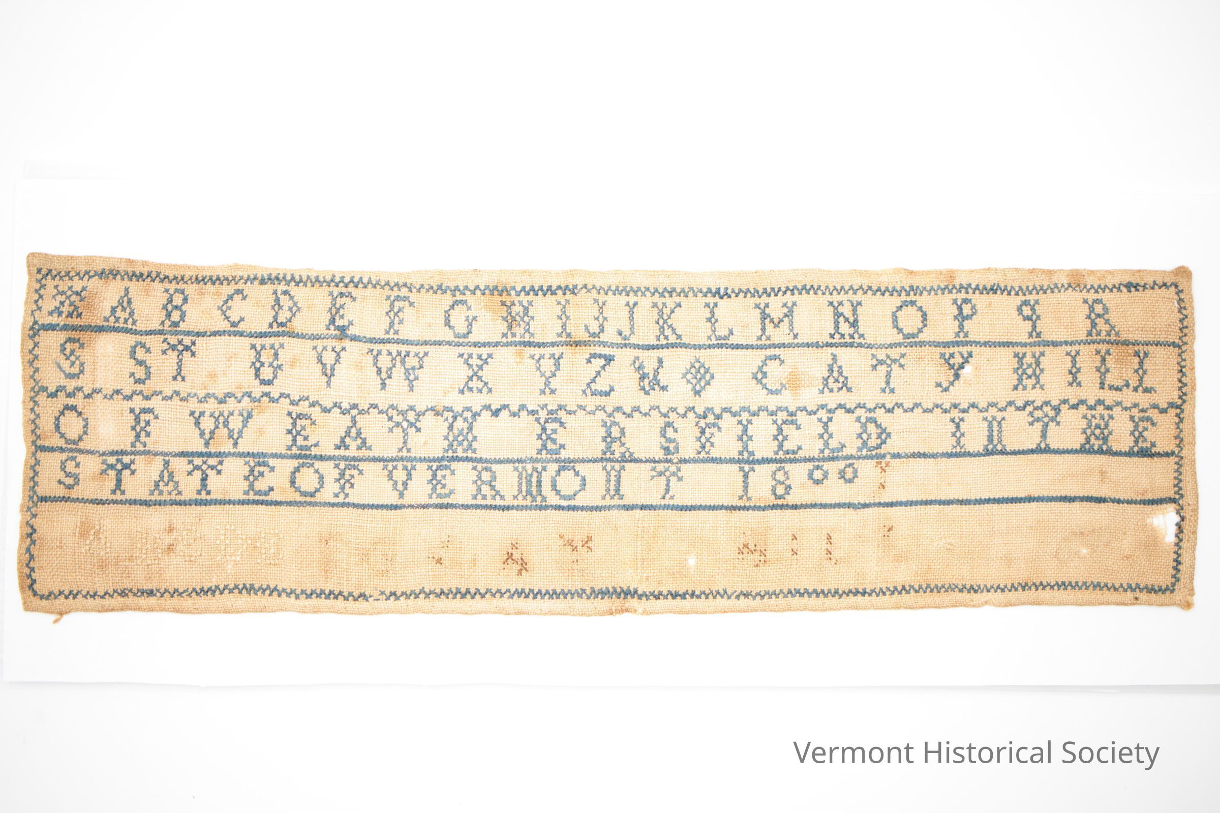 Rectangular alphabet sampler. The sampler is stitched entirely with gross stitches in blue thread and brown thread (now mostly gone), with a blue border and underlines. The sampler consists of a marking alphabet with alternates for A, J, and S, and an ampersand. Following the alphabet is the inscription, "CATY HILL OF WEATHERSFIELD IN THE STATE OF VERMONT 1800". The only legible part of the missing stitches are the letters A-G.Context