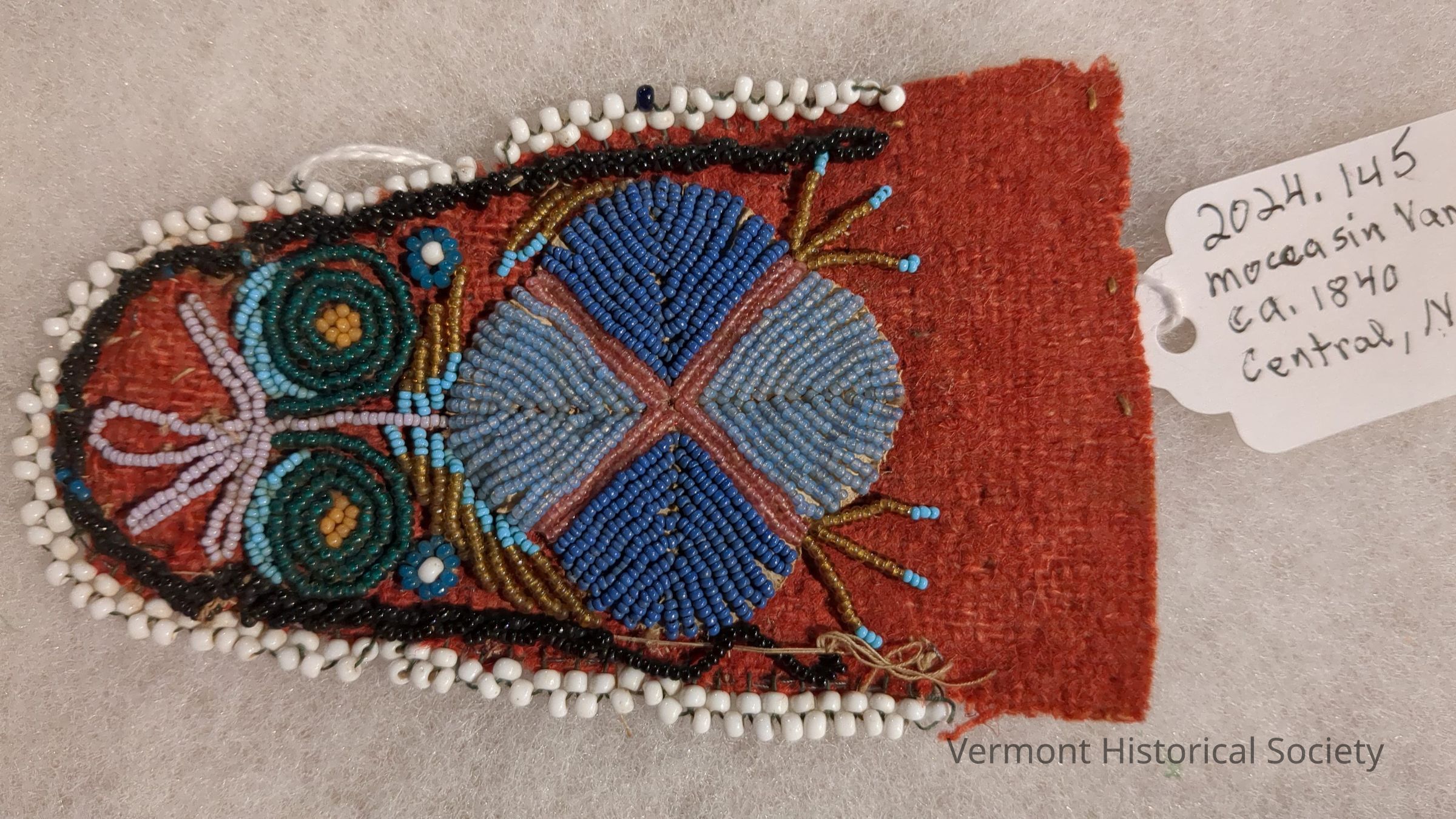 This single Moccasin vamp, with quatrefoil motif and tipped lines was found in Norwood, NH. It has a couple other regionally diagnostic motifs such as the two-color radiating lines and the green twisted outline beadwork.Acquisition