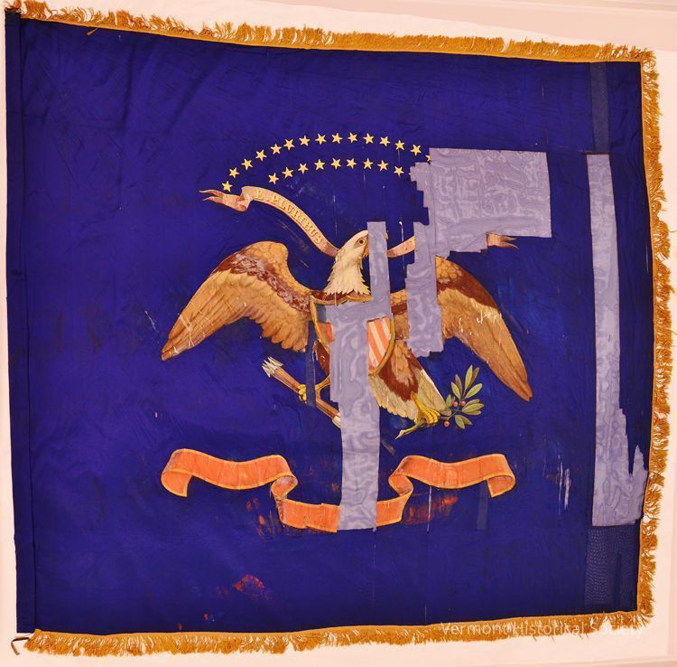 2nd Vermont Infantry regimental flag. Attached to staff by sleeve. Fringe present. A large eagle, with wings out swept, bearing the national shield on its breast lies in the flag's center. Above the eagle's head are thirty-four stars arranged in two arcs and below is a red scroll designed to bear the regiment's name but left blank.