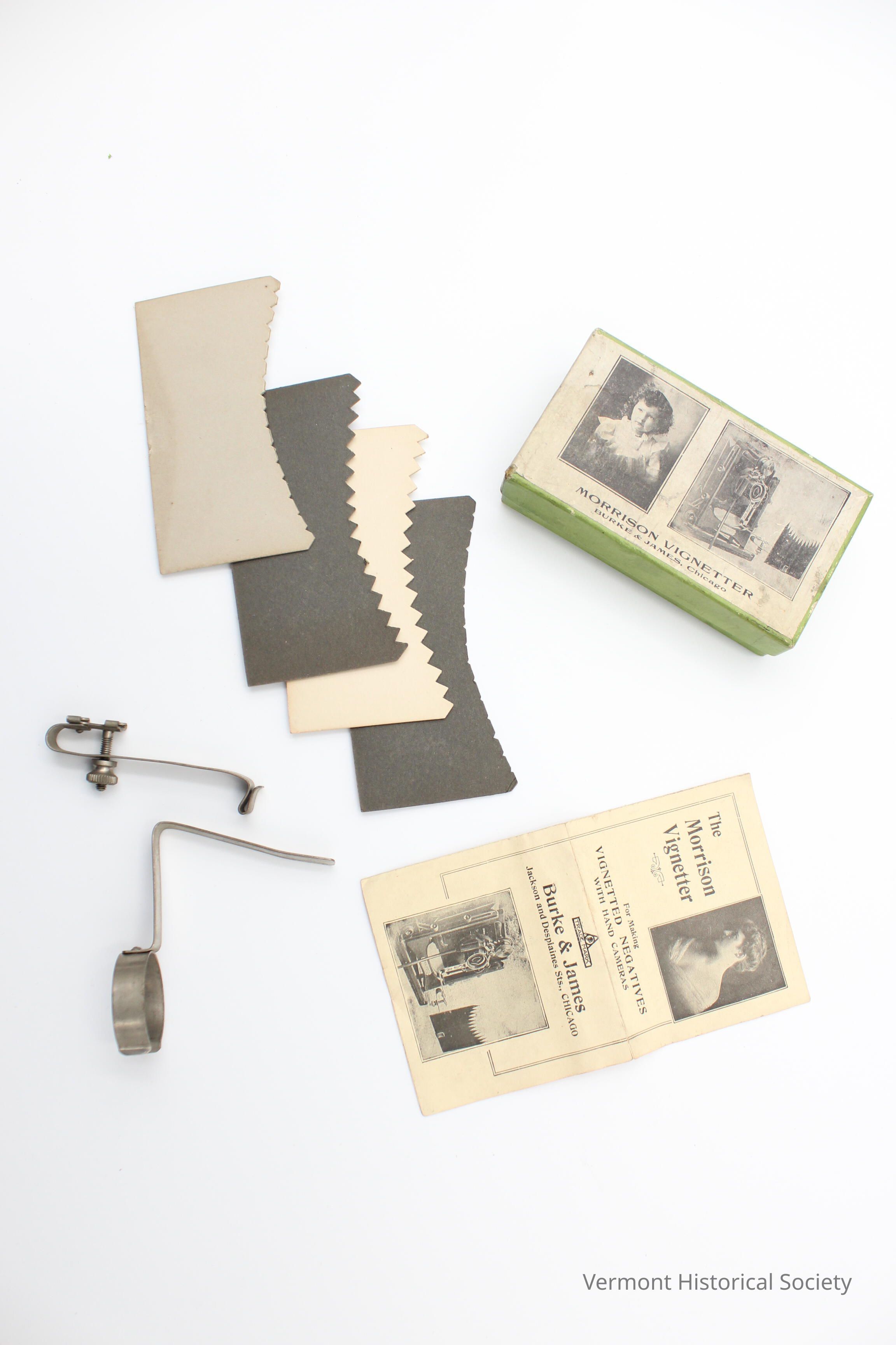 "Morrison Vignetter" camera accessory set consisting of a two-part mount, four vignetting cards, a box, and instructions.