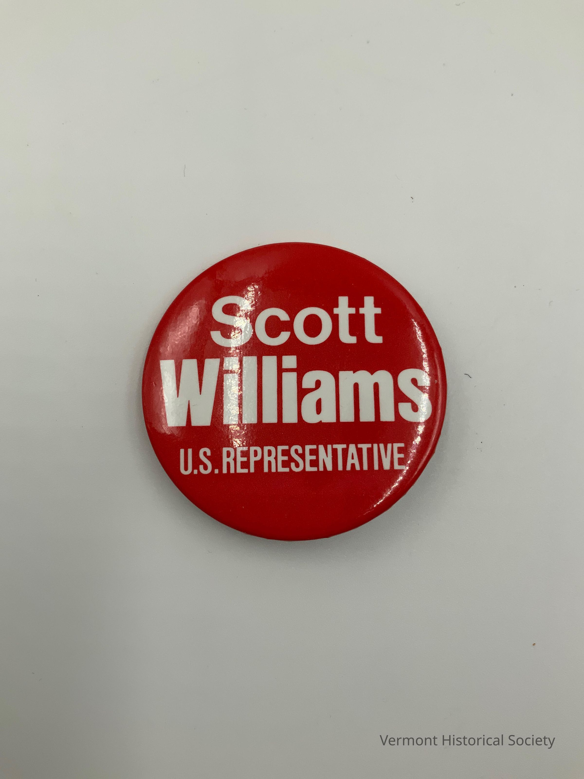 Round red button with the white inscription, "Scott Williams U.S. REPRESENTATIVE".