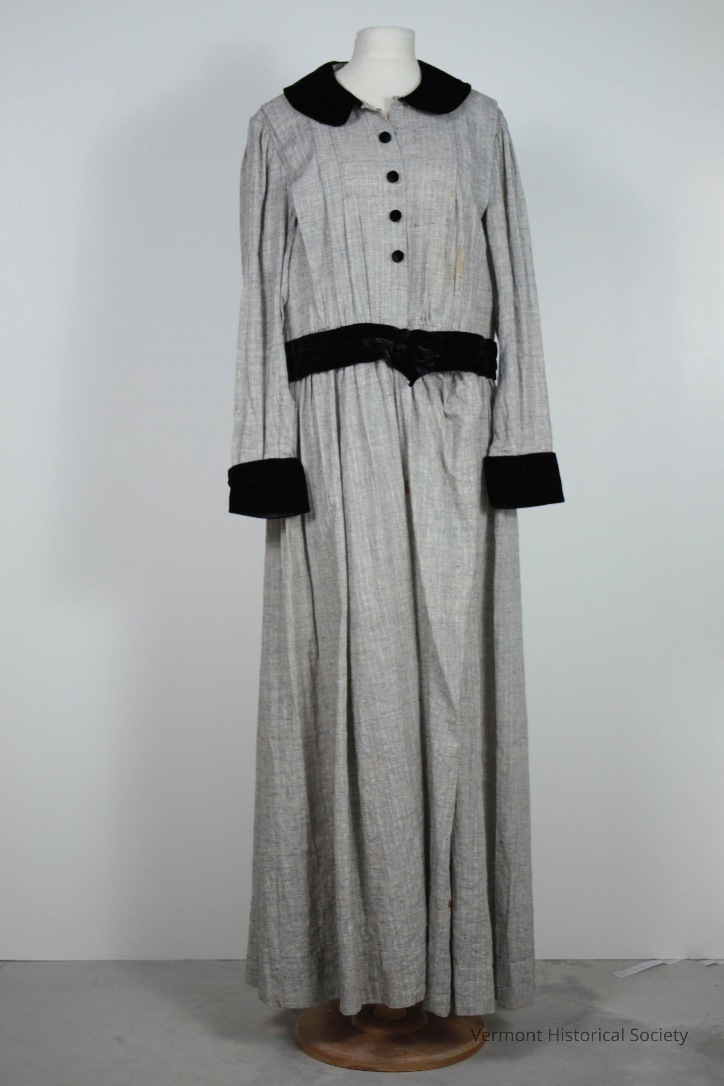 Grey cotton dress with long sleeves and a slightly dropped waist and floor-length hem. The dress secures at the center front with hooks and eyes beneath four velvet-covered buttons. The waistline, Peter Pan collar, and sleeve cuffs are trimmed in black velvet, and there is a velvet bow at the center front of the waistband. The bodice has three outward-facing tucks and both the bodice and skirt gather into the waistband. The dress has an inner bodice, attached to the outer fabric at the back but not the front, that secures in the center front with seven white glass buttons.Context