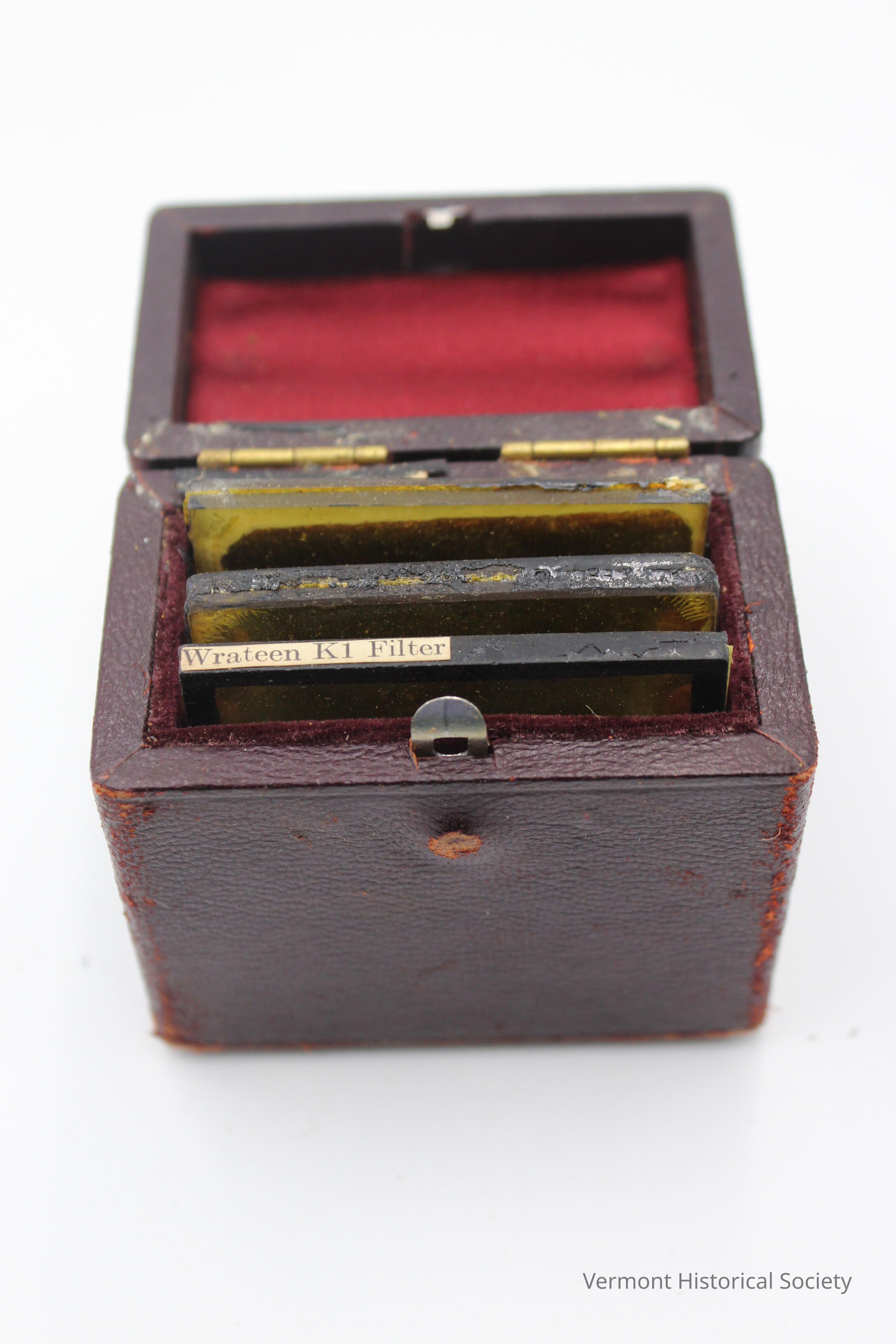Three yellow camera filters and a Morrocan leather case. The filters consist of two panes of glass adheared together. A glossy black film was painted around the edges of the filters, but it only completely remains on one. The same filter with the frame retains a paper label along its narrow edge reading, "Wrateen [sic] K1 Filter". Four other paper labels are loose in the container and bear the inscriptions "Wratten K2 Filter", "Wratten K1 1/2 Filter", "Wratten No. 7 Filter", and "Wratten No. 6 Filter".