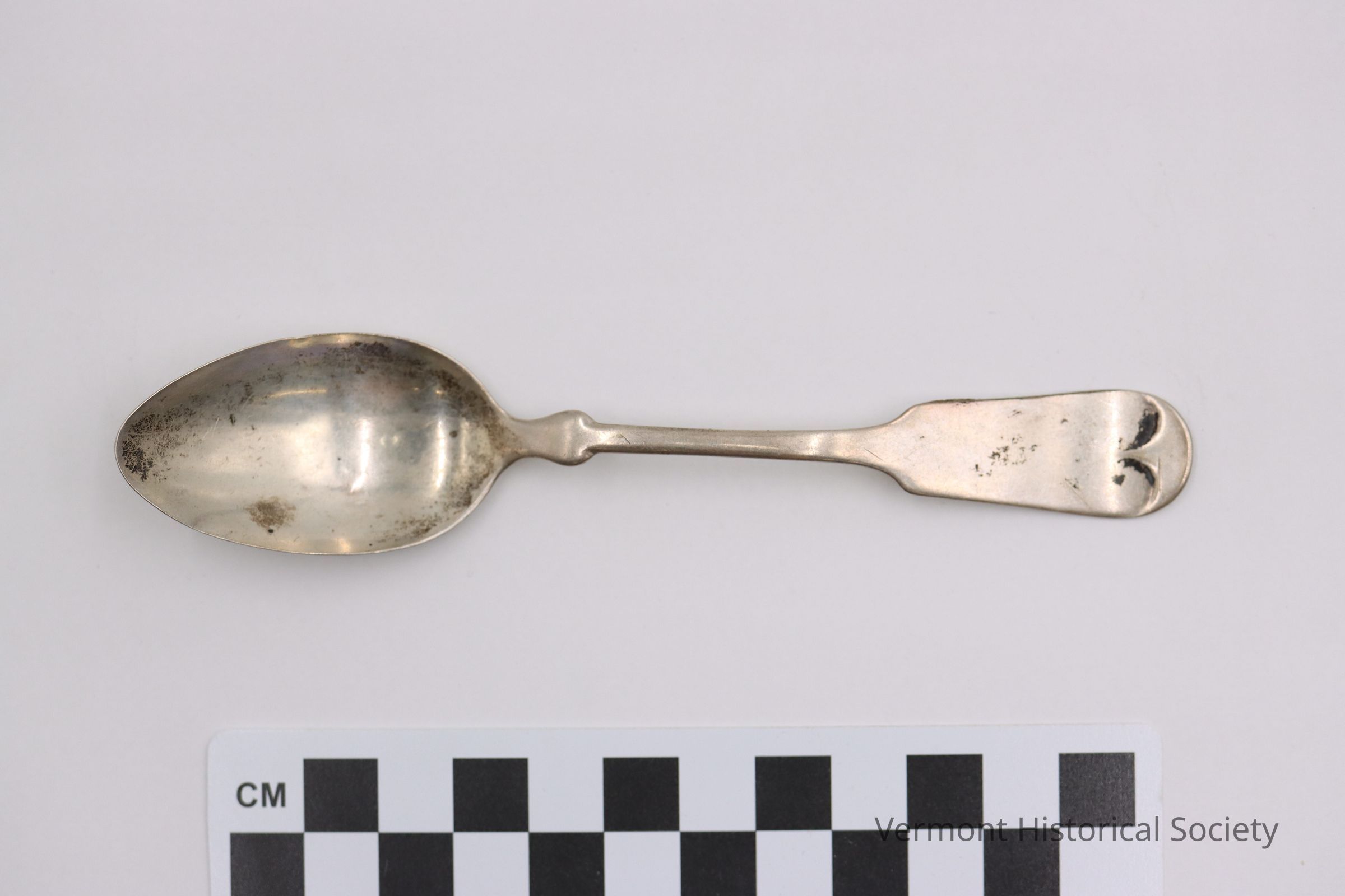 Silver teaspoon. The reverse of the handle is marked with the word "STERLING" and a W over an arrow.