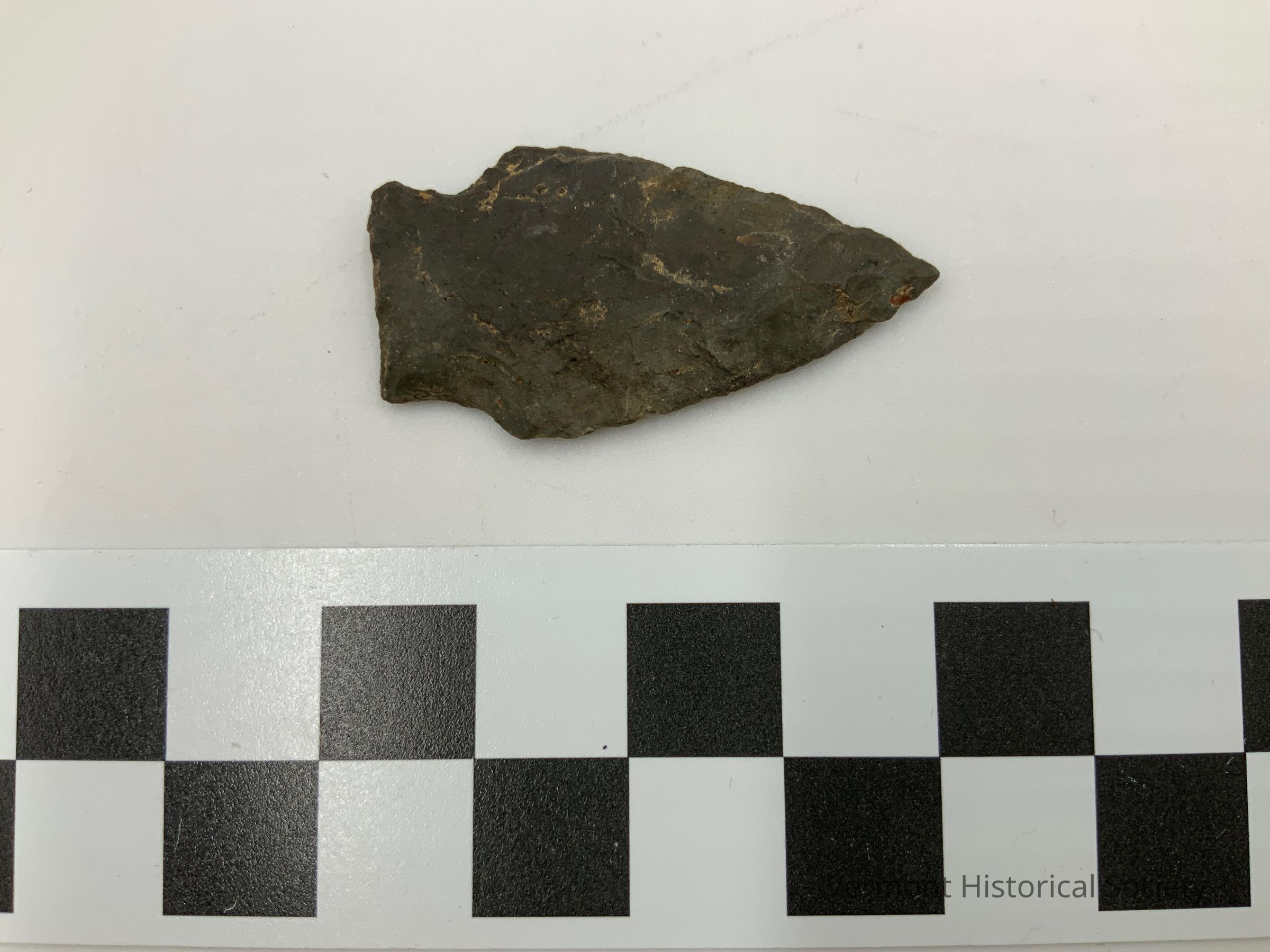 Gray chipped stone projectile point made of slate. It has a straight stem, and the blade edges curves outward slightly.Context