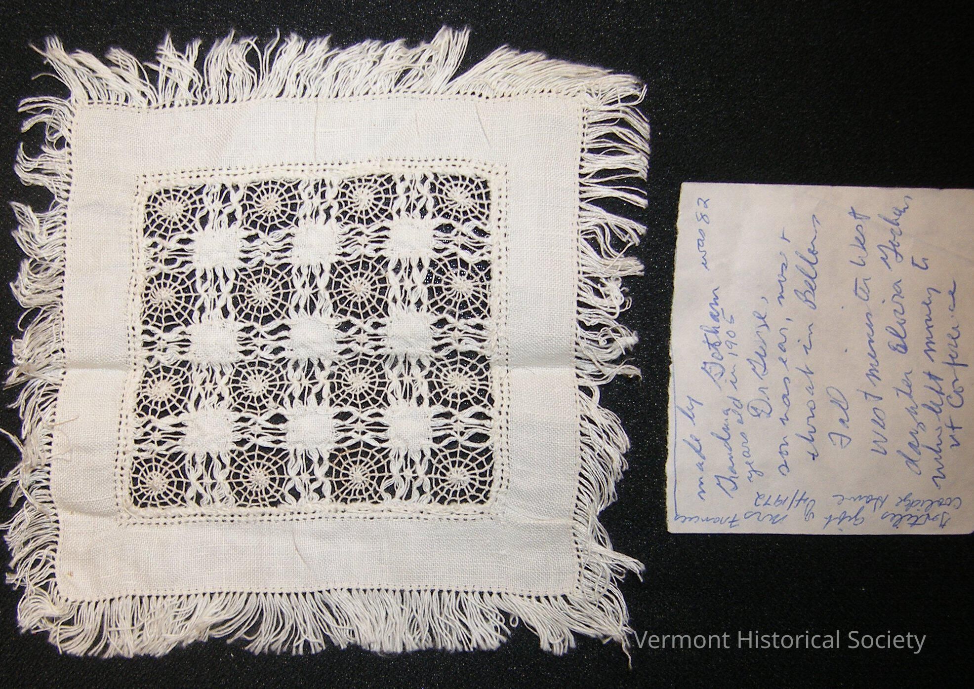 Square with drawnwork lace in the center. The lace is in a checkerboard pattern, alternating between solid squares and a spiderweb design. The 4 sides are edged with fringe.Context