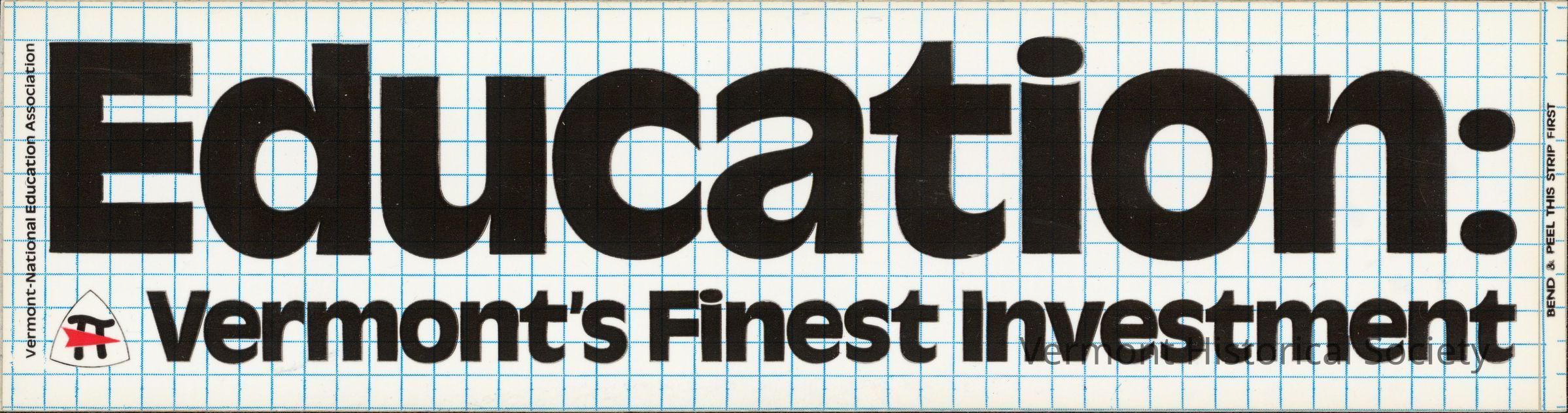 Bumper sticker with "Education: Vermont's Finest Investment" in black lettering on a blue and white grid line background.