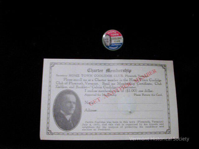 Button and Membership card. Pin has an image of Calvin Coolidge on the left, the words "Home Town" at the top in white in a red background, the words, "Coolidge Club" in green in a white background in the center right, and the words, "Plymouth, Vermont" in white on a blue background at the bottom. The pin has a green rim. The pin is accompanied by a card that said it was for a charter member of the Home Town Coolidge Club.Context
