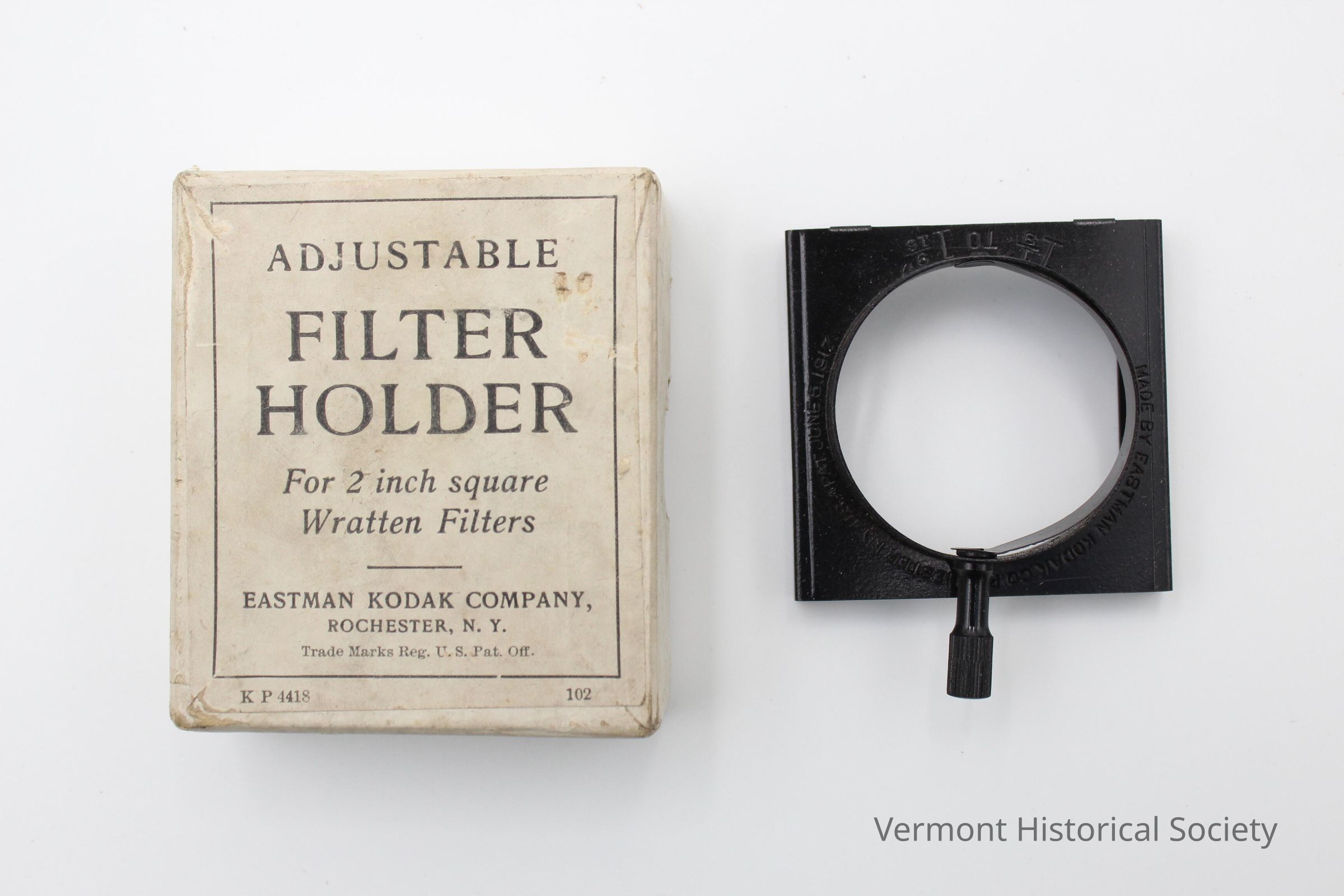 Metal bracket for holding a filter up to the lens of a camera, together with box and lid. The box is covered in glossy white paper, and a label on the top reads, "ADJUSTABLE FILTER HOLDER/For 2 inch square/Wratten Filters/EASTMAN KODAK COMPANY,/ROCHESTER, N.Y./Trade MArks Reg. U.S. Pat. Off./K P 4418 102."