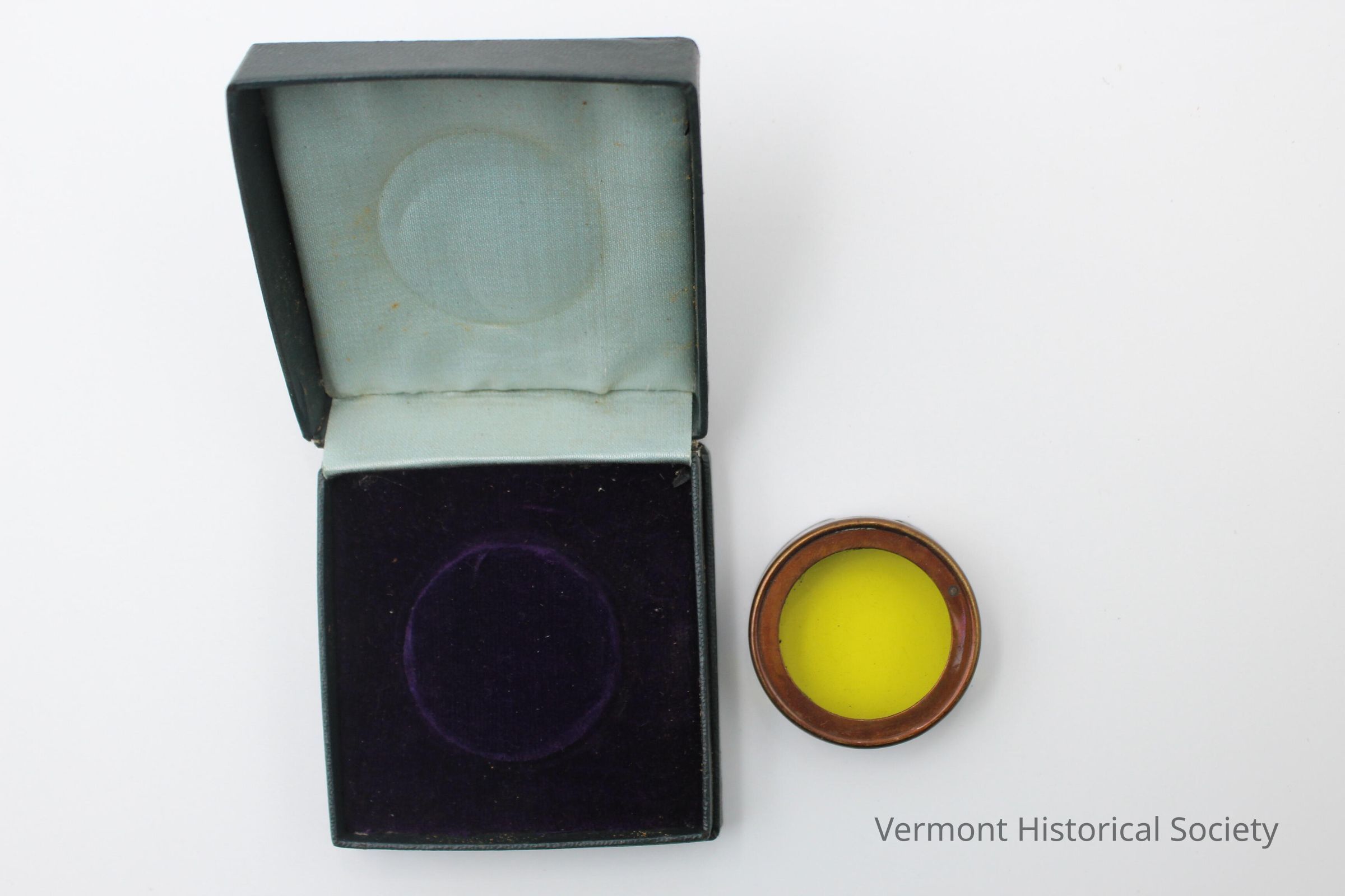 Circular yellow filter with green leather case. The filter consists of a round pieces of yellow glass set into a copper frame. The back is finished with a glossy black substance. Three indentations are placed equidistant around the frame to secure the filter onto a camera lens.