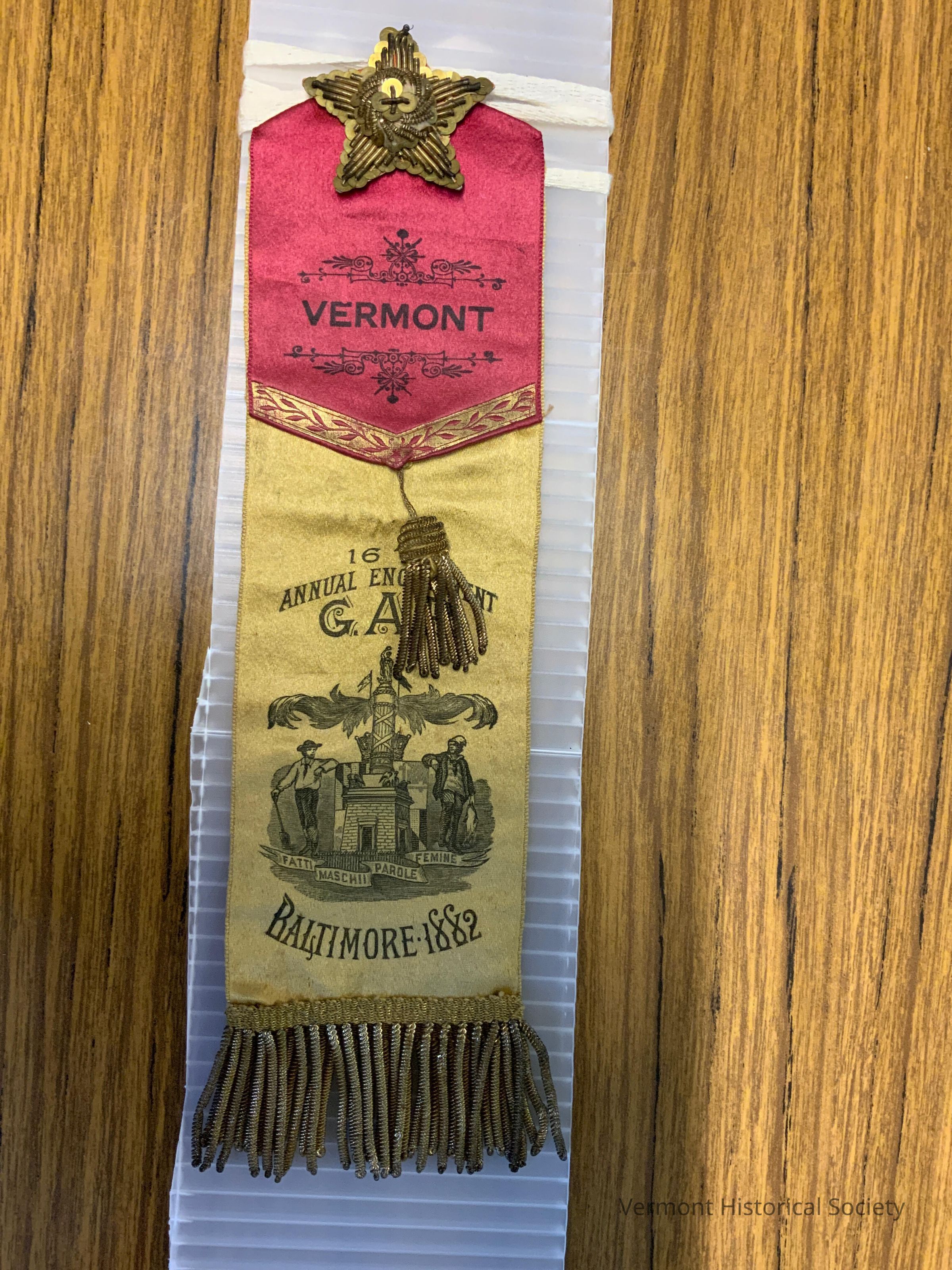 Long, yellow satin-woven silk ribbon printed with an image of two men leaning on a monument and the inscription, "16th ANNUAL ENCAMPMENT G.A.R. BALTIMORE 1882". There is a five-pointed star made of gold sequins and springs and a short pink ribbon printed with the word, "VERMONT". There is a gold tassel hanging from the bottom of the pink ribbon, and gold fring at the bottom of the yellow ribbon.Context