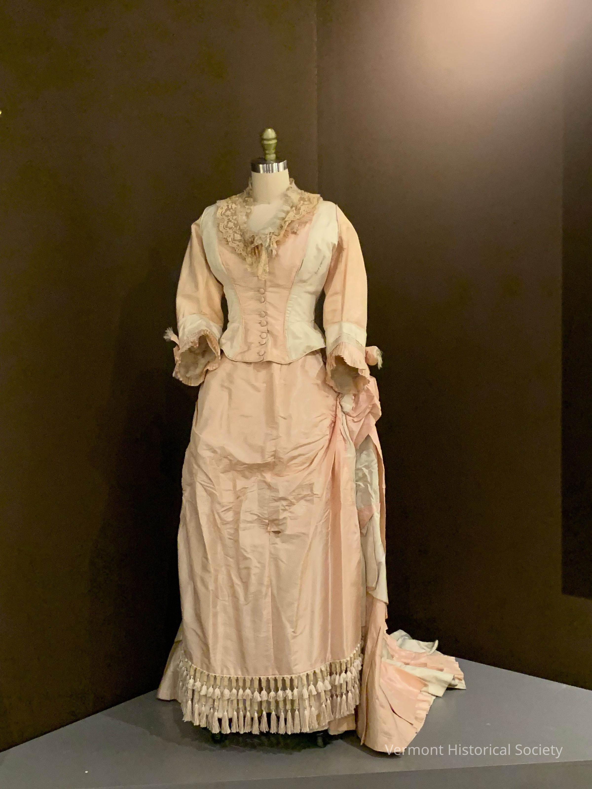 Worn by Leonora Brooks Shepherd to the opening ball of the Pavilion Hotel in Montpelier, Vermont. The dress was remade from two of Shepherd's dresses: the pink from a dress in her trousseau, and the cream from her wedding dress.Acquisition