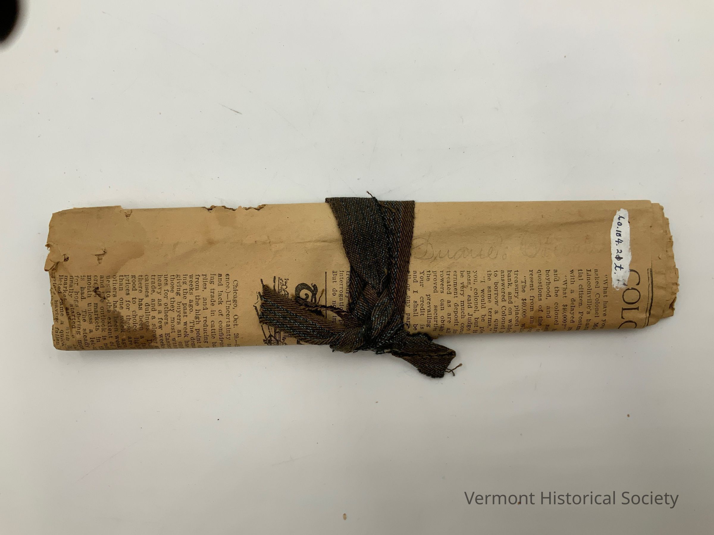 Sewing pattern cut from a newspaper. The pattern pieces are folded, then rolled together and tied with a strip of blue and brown cotton denim. The outermost piece is labeled in pencil, "Duane's Overalls", along one edge.Context