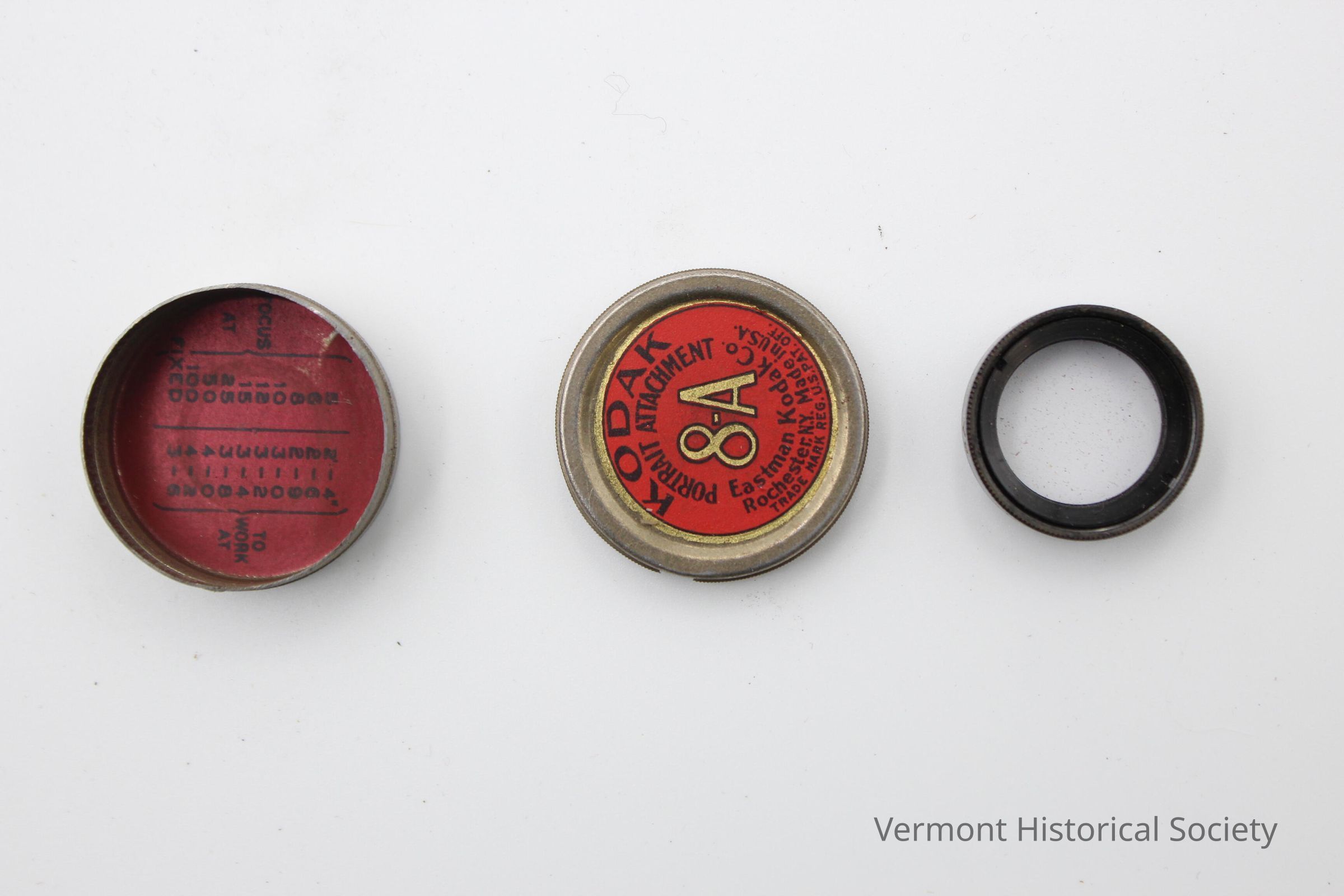 Portrait lens attachment and case. The lens consists of a circular piece of glass set within a black metal frame. the frame extends beyond the glass at both the front and the back. The back extension is cut into tabs in order to secure onto a camera lens. The metal case consists of a circular base and lid. The lid bears the label, "KODAK/PORTRAIT ATTACHMENT/8-A/Eastman Kodak Co./Rochester, N.Y. Made in U.S.A./TRADE MARK REG. U.S. PAT. OFF." The interior of the case is printed with a focus guide giving the focal length at which to set the camera with the lens on (i.e. "focus at 5' to work at 2'-4'")Use