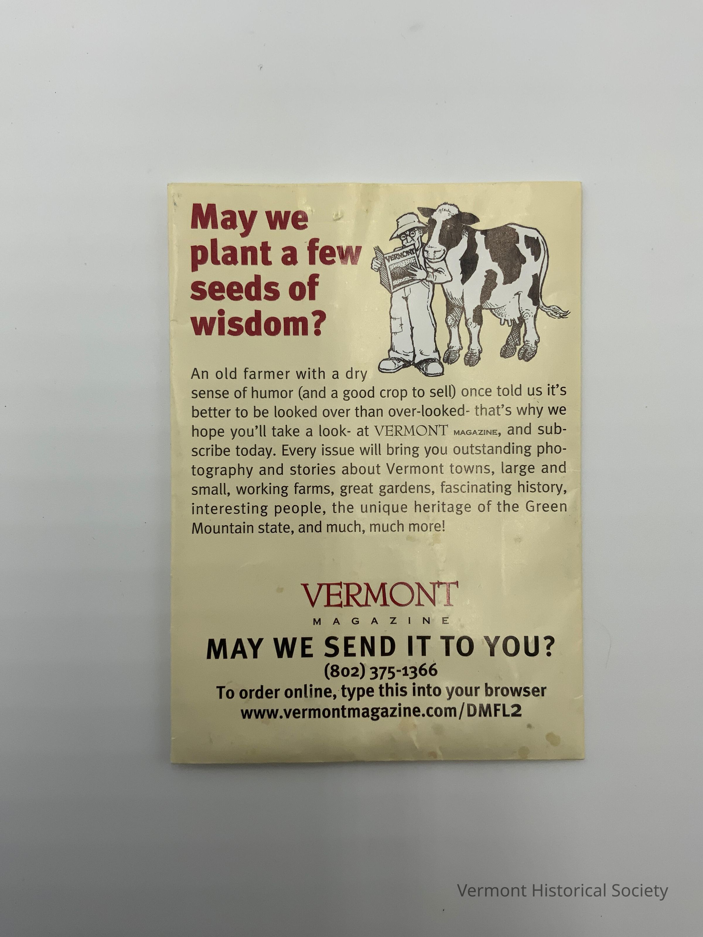 Rectangular paper seed packet. The front of the packet is printed with the inscription, "May we plant a few seeds of wisdom?", and illustration of a man and cow reading a magazine, and the text logo of Vermont Magazine. A longer inscription indicates that the packet was sent to entice subscriptions to the magazine. The back is printed with planting instructions and indicates the seeds are a mix of wildflowers.