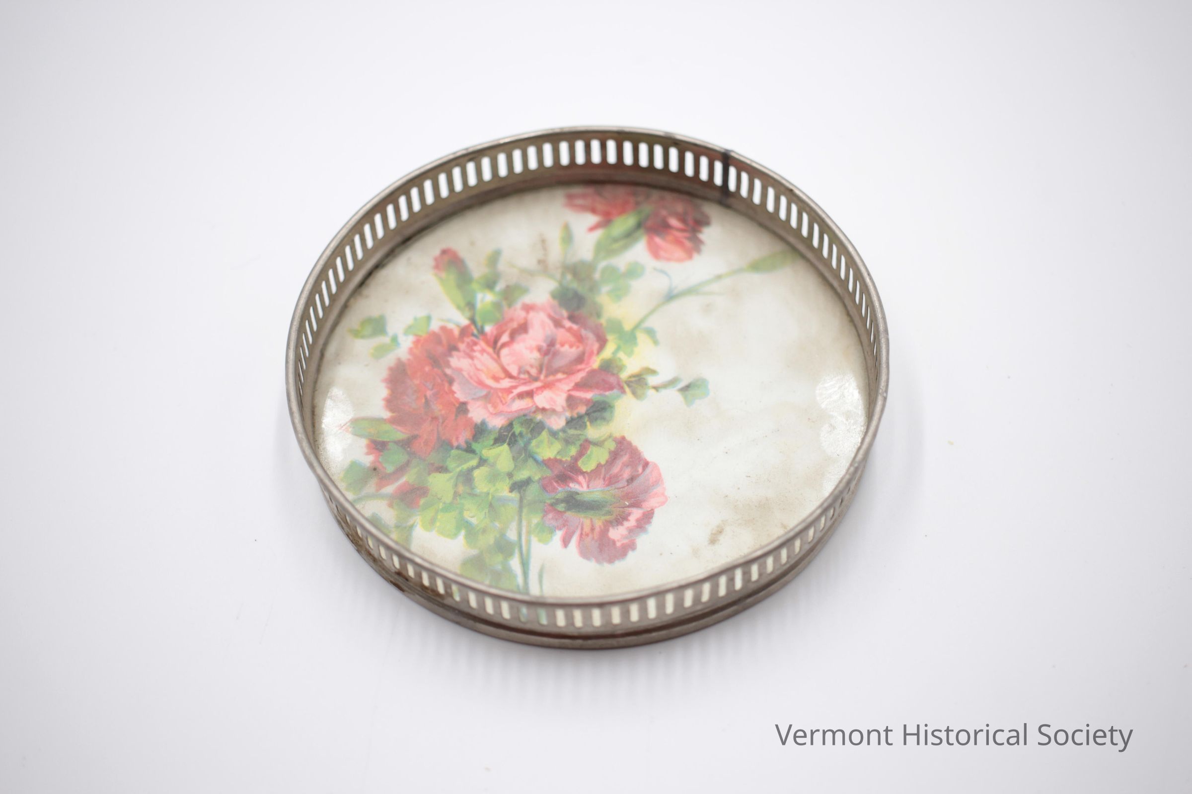 Silver wine bottle coast with a design of red and pink carnations in the center. The outer edge has a short border of pierced silver.