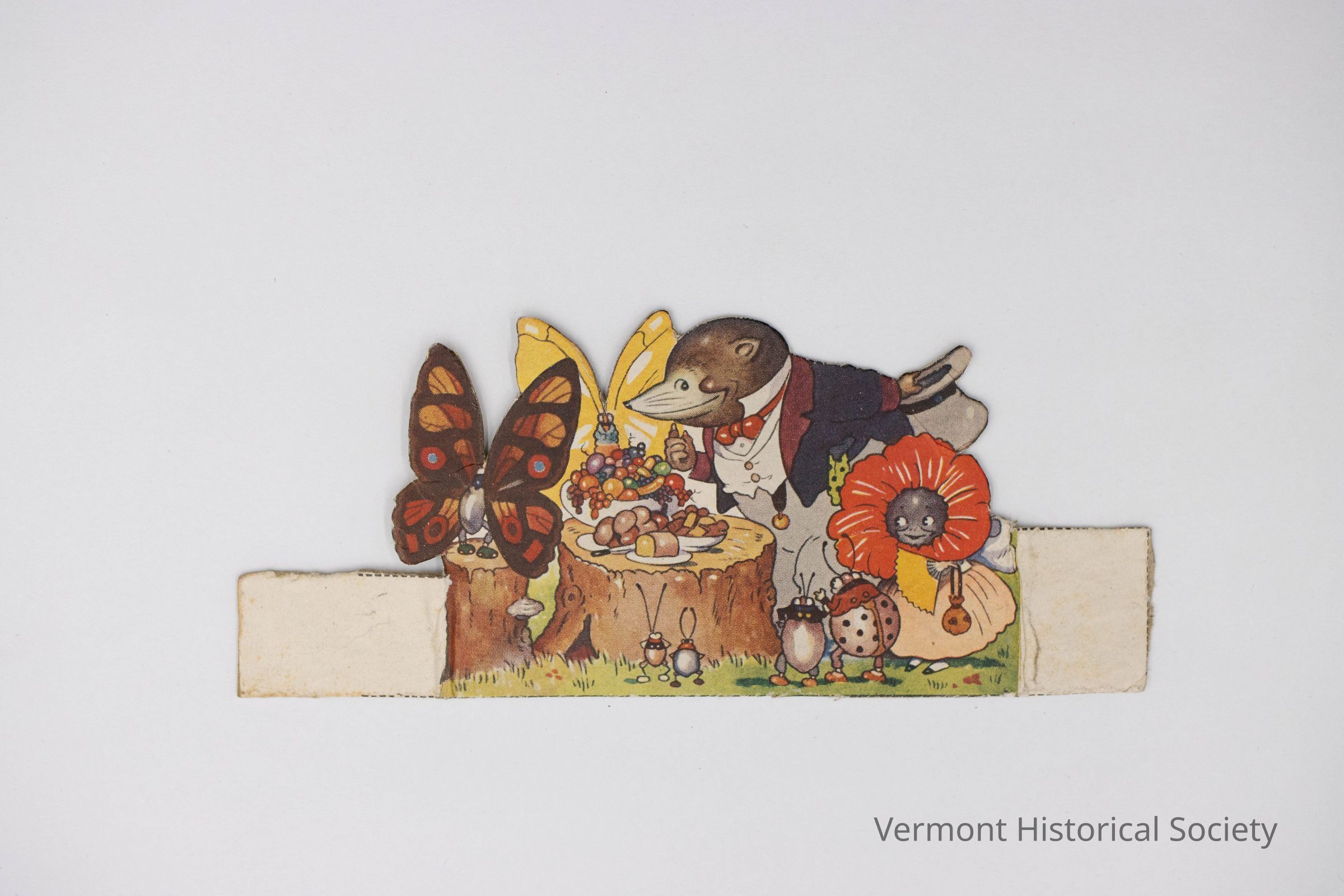 Small, cut-out cardboard stand showing a mole leaning over a tree stump laden with nuts and berries on serving plates. He is accompanied by two butterflies, 4 beetles, and a poppy in a dress. There are two rectangular extensions on either side of the bottom that fold back to form a base. The back is labeled "Sterling" in pencil, in a child's handwriting.Context