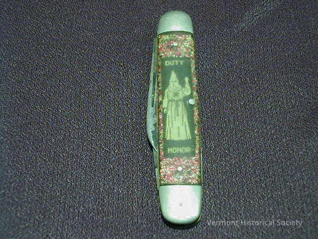 Folding pocket knife with two blades. The blades extend from opposite ends of the handle. One side of the handle is clear plastic over a bed of glitter, with an illustration of a person in a white, hooded robe flanked by the words "DUTY" and "HONOR". The other side is clear plastic over a bed of glitter with a central logo that reads "100%" at the top, with a Christian cross in the center, and a triangle holding the initials KKK at the bottom.Context