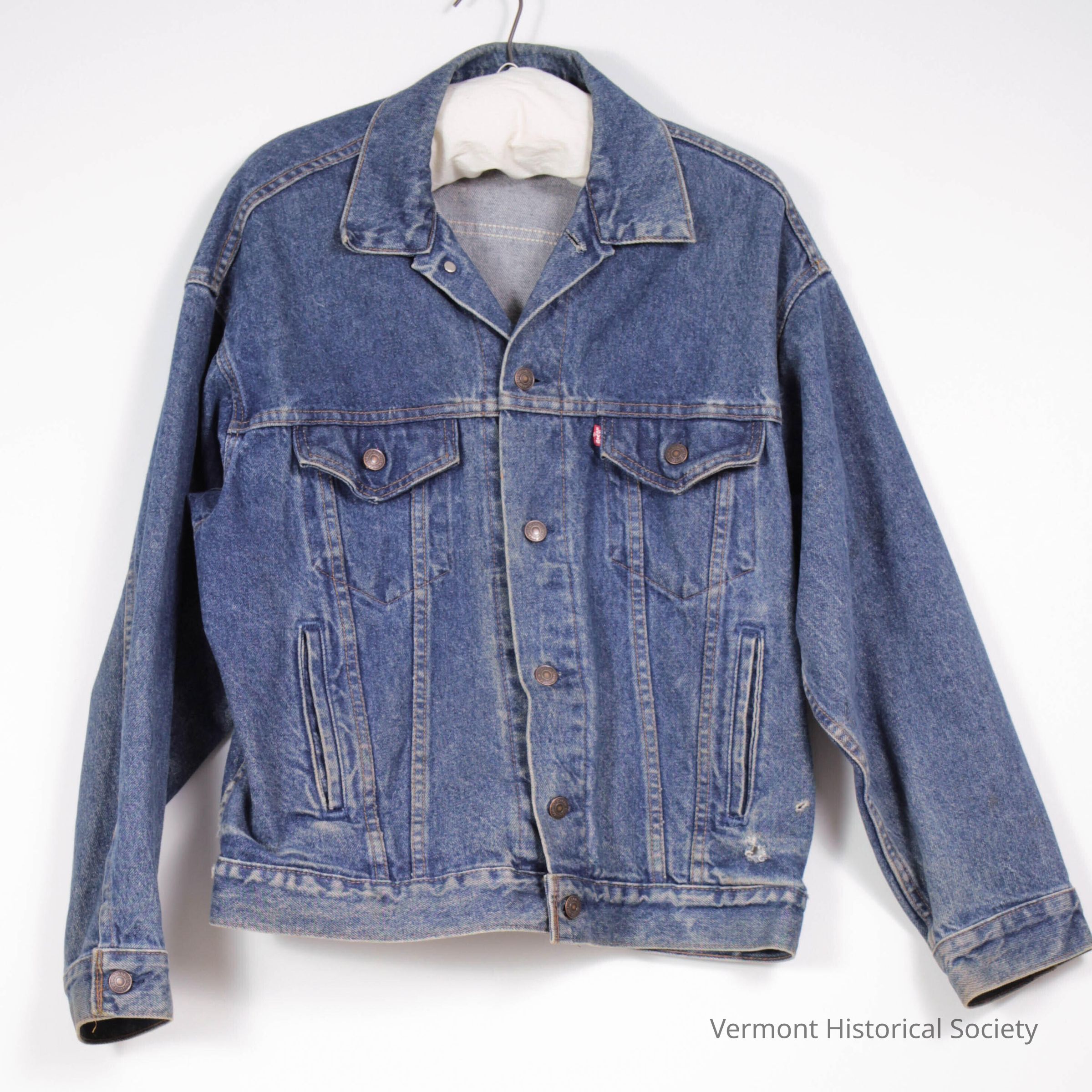 Blue denim jacket. The jacket secures up the center front with 6 metal buttons. There are two "hand warmer" pockets at the side waistline and two breast pockets that secure with pointed flaps and metal buttons. There is a small red tag attached to the left breast pocket that reads, "LEVI". Each button is molded with the inscription, "LEVI STRAUSS & CO SF CAL". The center back neckline has a leather tag that reads, "Levi Strauss & Co. San Francisco, Cal. Trade Mark Since 1850 Size M".Context