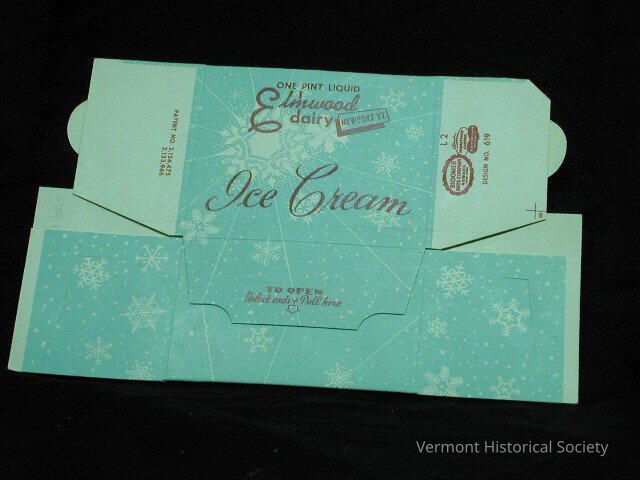 Cardboard ice cream carton. The carton has a snowflake pattern on a light blue background. The red printed text alternates between cursive and print, and says “ONE PINT LIQUID / Elmwood / dairy / Ice Cream.” A rectangle with a drop shadow contains the text “NEWPORT VT.”