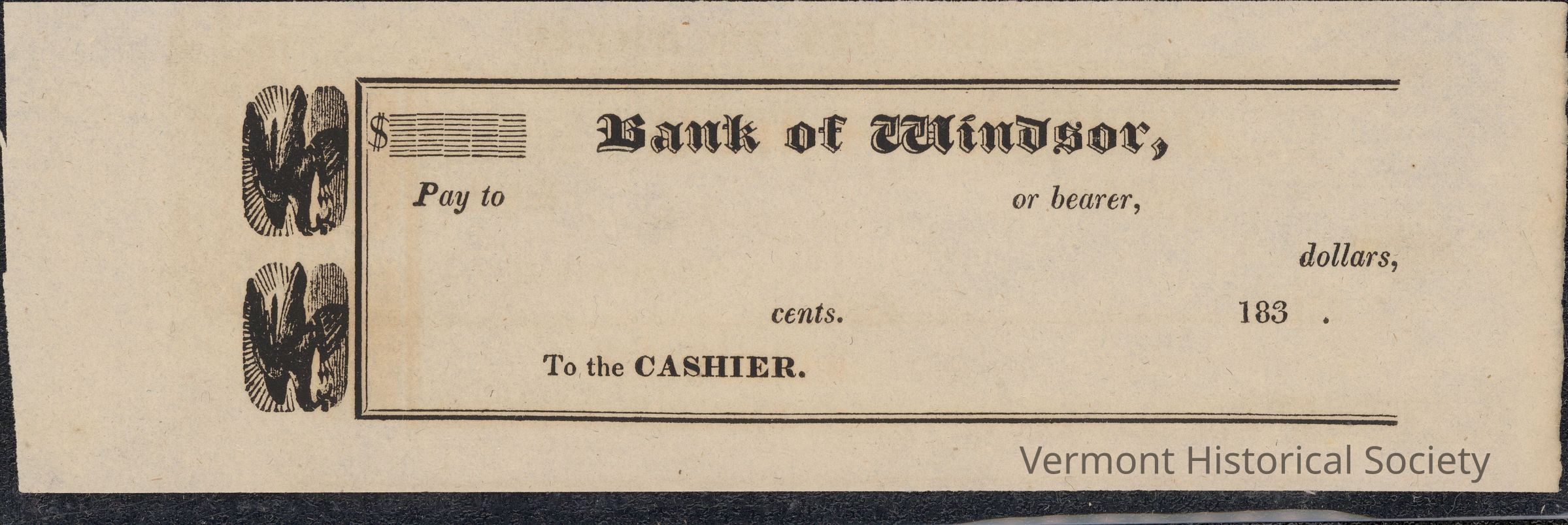 Unfilled private bank note or check from Bank of Windsor. There are 2 eagles printed on the left edge.