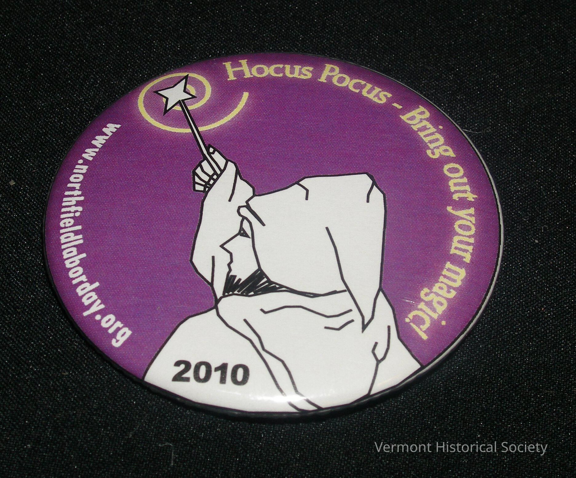 Button from the 2010 Northfield Labor Day celebration. The button has a bearded wizard in the center of the button holding up his wand. A 4-pointed star is at the tip of the wand and a swirl is coming off the star. The wizard's back is to us, but we see his profile. He is wearing a white garment and has a hood draped down his back. Around the edge of the button reads: "www.northfieldlaborday.org / 2010" and starting at the top by the wand is: "Hocus Pocus - Bring out your magic!".
