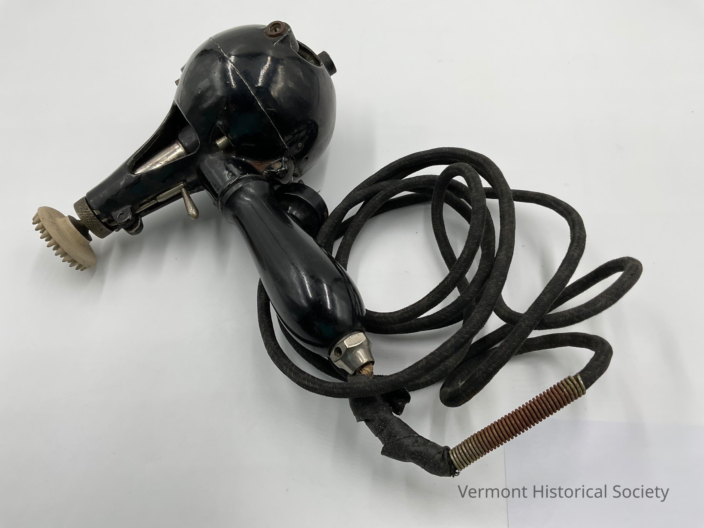 Electric vibrator and storage case. The vibrator consists of a handheld machine with a black handle and long, cotton-covered electrical cord. There are 4 head attachments: flat rubber circle with several extending tines; flat black plastic circle; large rubber fluted cup; small rubber cup. The device is in a leather-covered case lined with velvet on one side and greet satin on the other side.