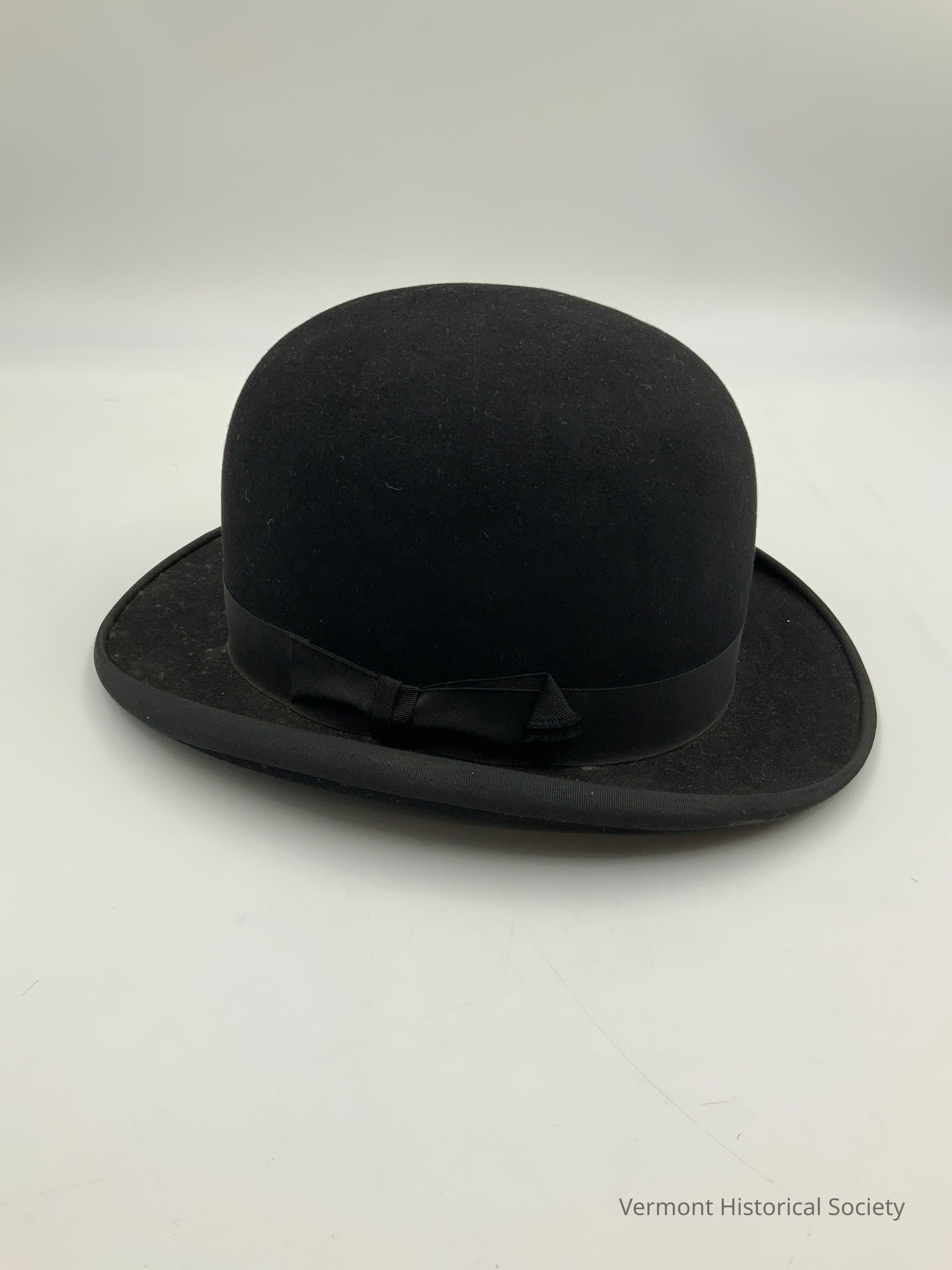 Black wool derby hat with a black grosgrain ribbon around the base of the crown. The interior lining is marked with the label, "Twigg's St. Albans, Vt." A sticker marks the size as 7 1/4.