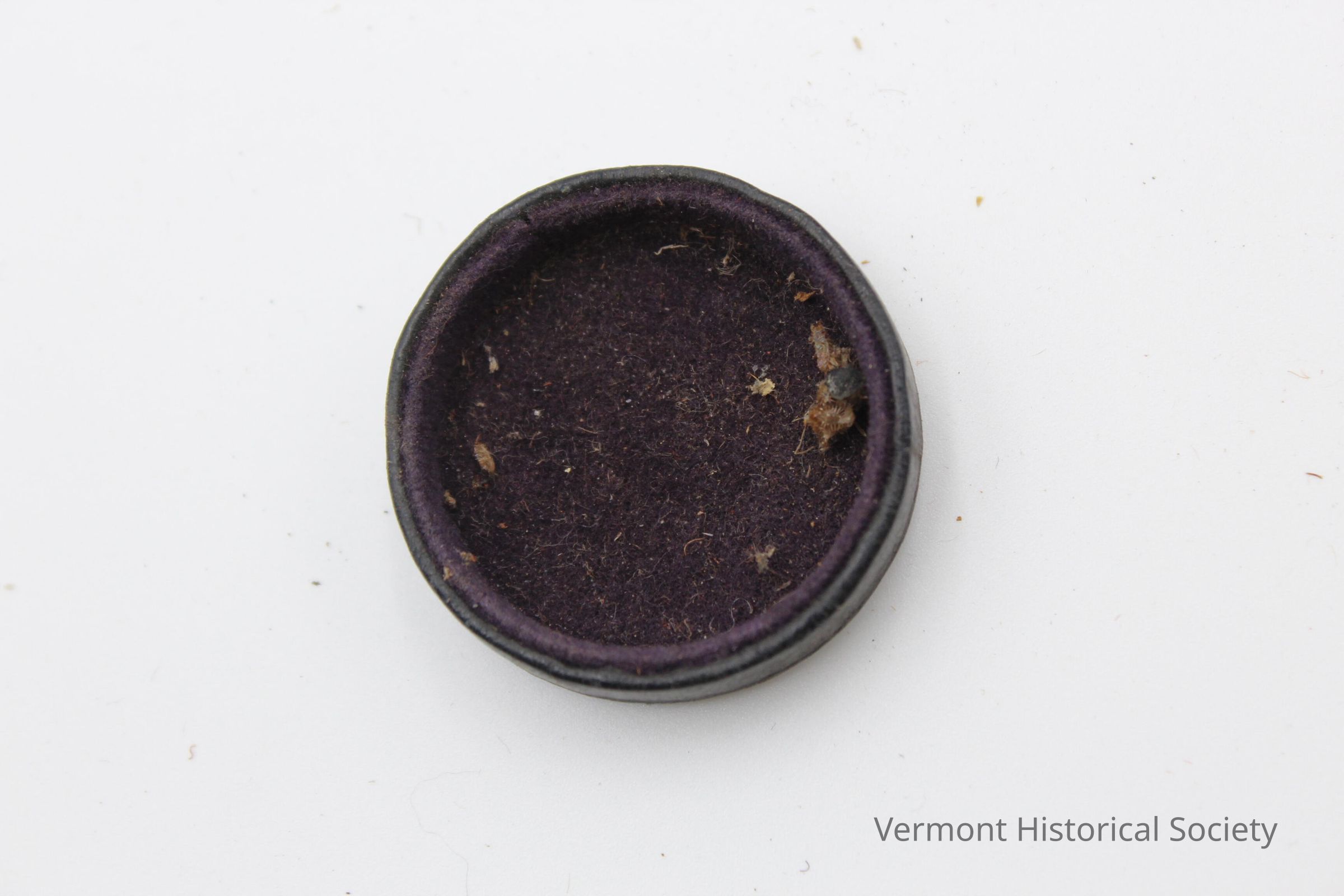 Lens or filter box without lid. The case consists of a round disk covered on the exterior with black leather and lined with purple velvet.