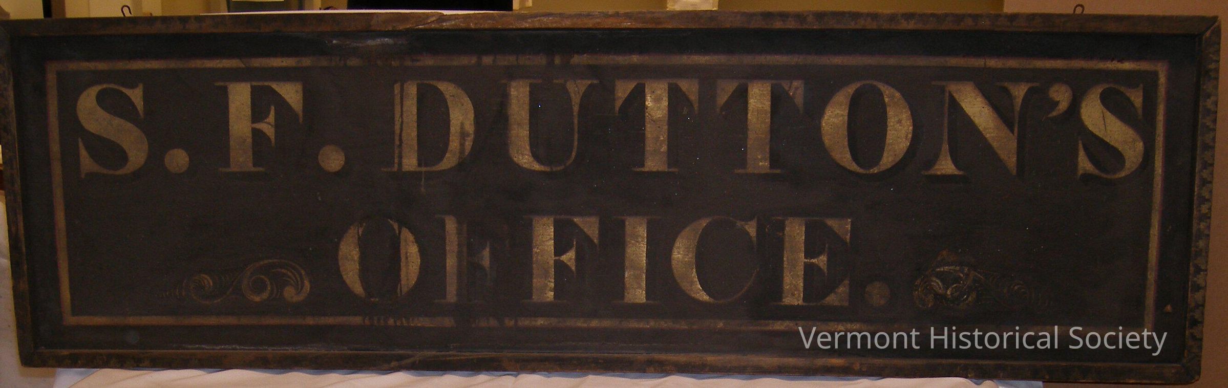 Salmon Fletcher Dutton was born in Cavendish, Vermont in 1803. He was a lawyer and probate court judge for Windsor County. This sign hung on his home in Cavendish where he died in 1857. The Dutton House was moved to the Shelburne Museum in 1945.