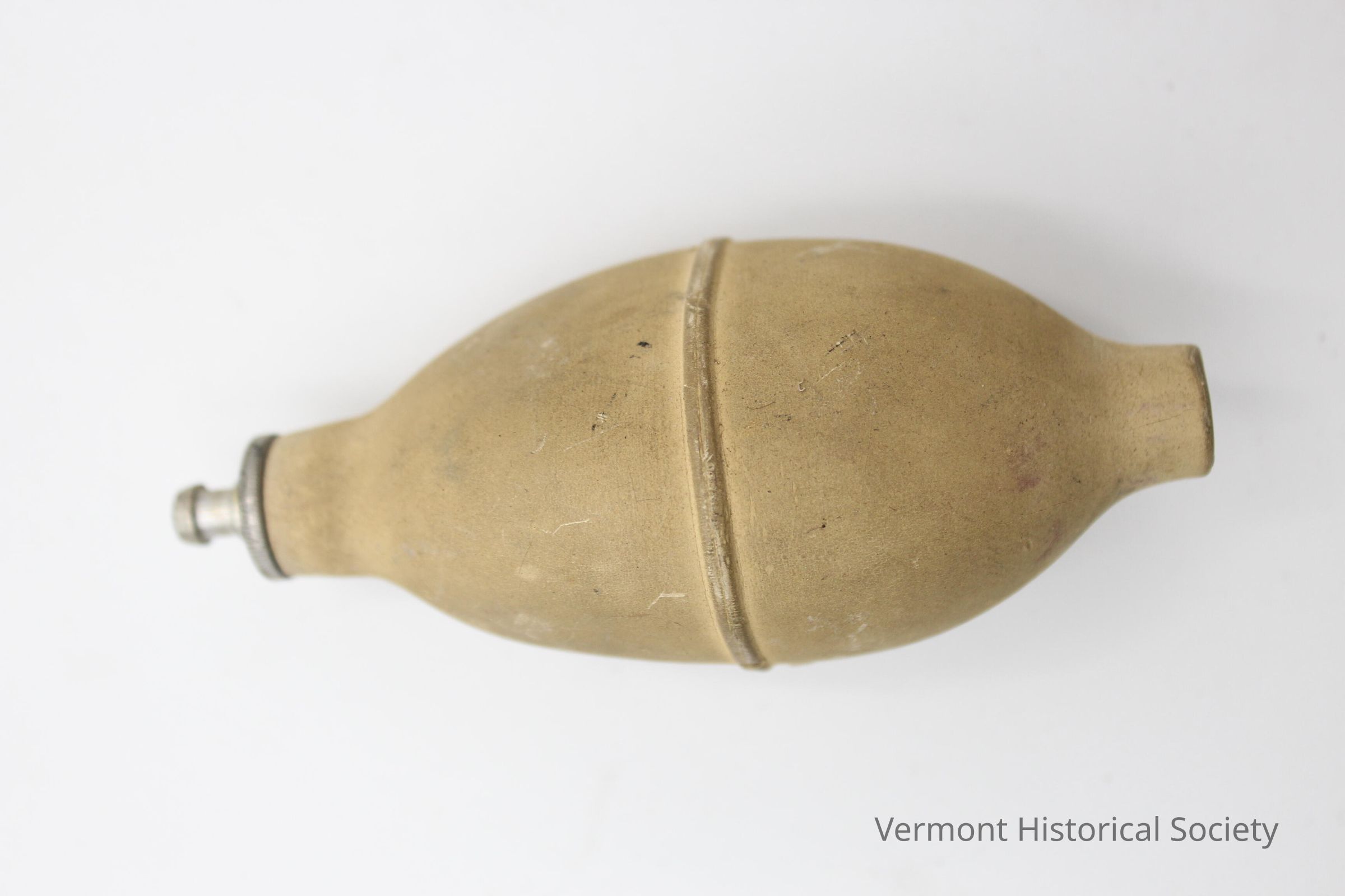 Bladder for releasing camera shutter. The body consists of white rubber in a lemon shape. One end is capped with a metal attachment.