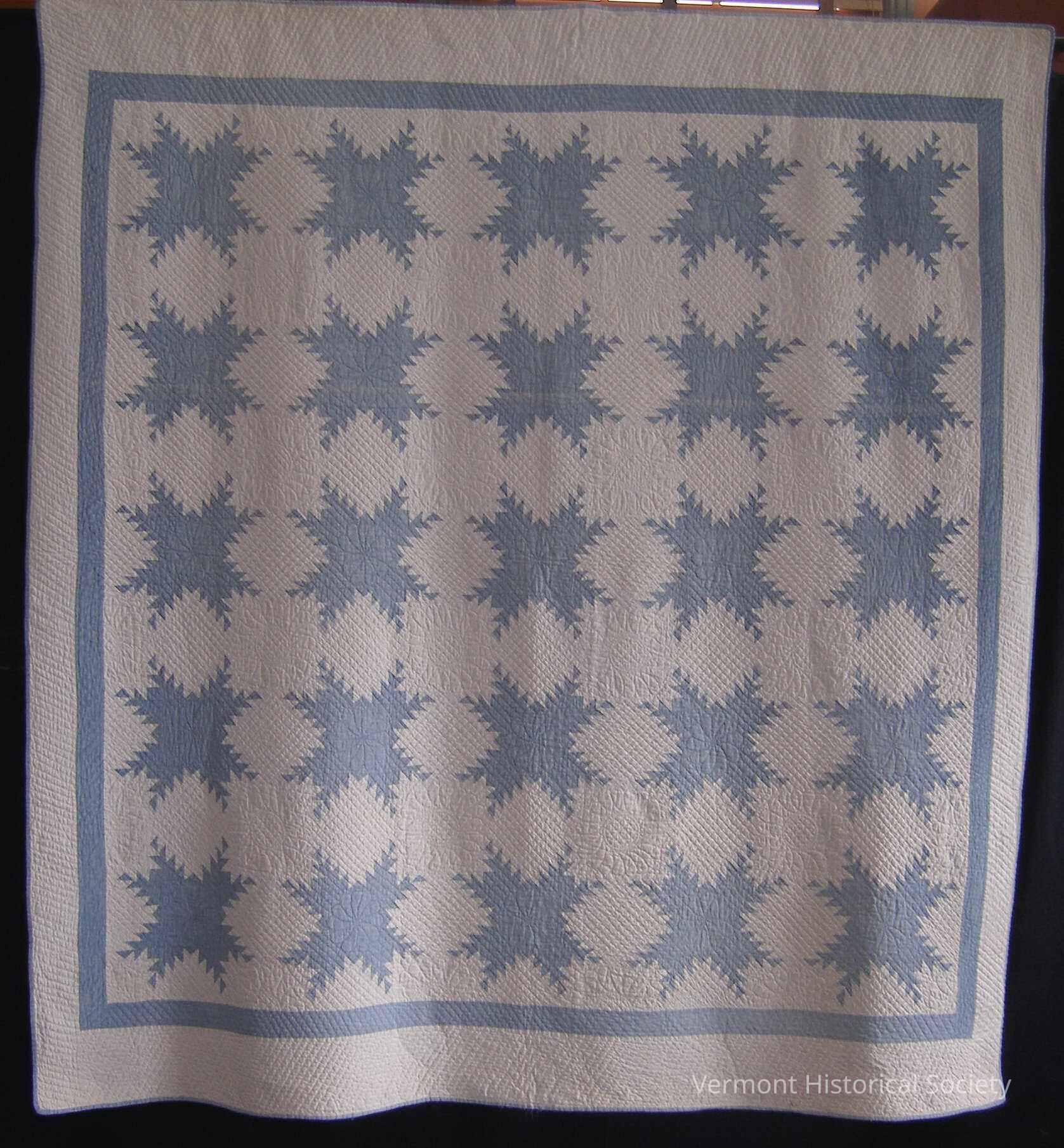 Pieced quilt in a feathered star pattern. The quilt is pieced from two fabrics: solid white cotton and solid blue cotton. It is hand quilted with flowers quilted into every other white square and the center of the blue stars. One corner is embroidered in light blue thread with the inscription, "Pieced and Quilted by Cynthia (Lamoureux) Osborn Isle La Motte Vermont About 1900".Context