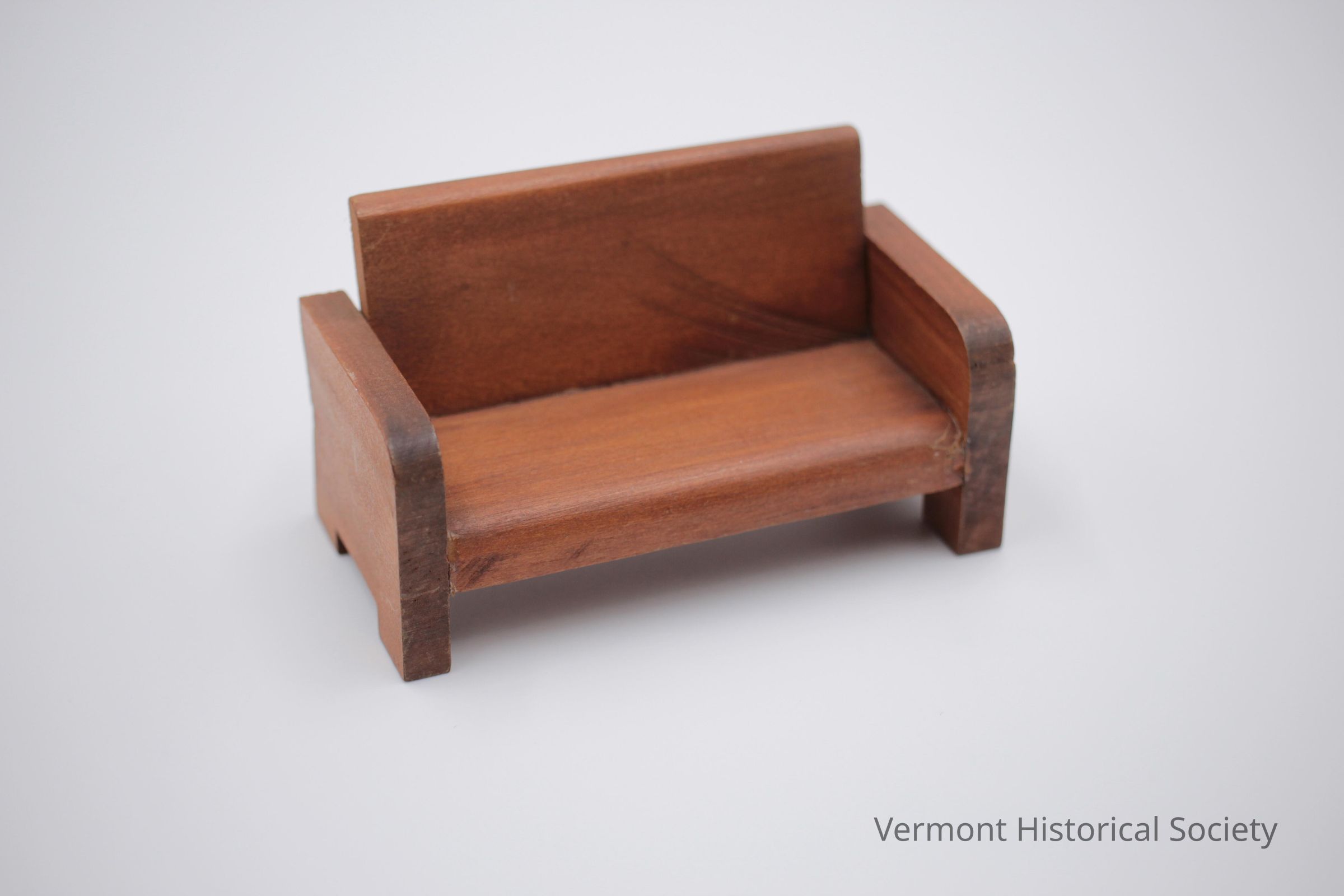 Wooden dollhouse sofa. The sofa is constructed from four pieces and held together with glue. The front edges of the arms are rounded.