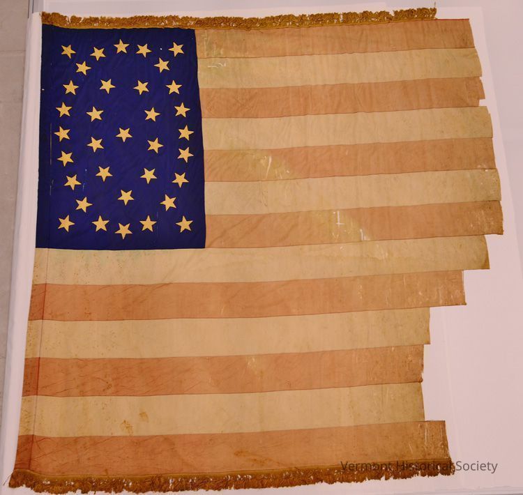 3rd Vermont Sharpshooters national flag with red and white stripes. Stars in elliptical pattern.