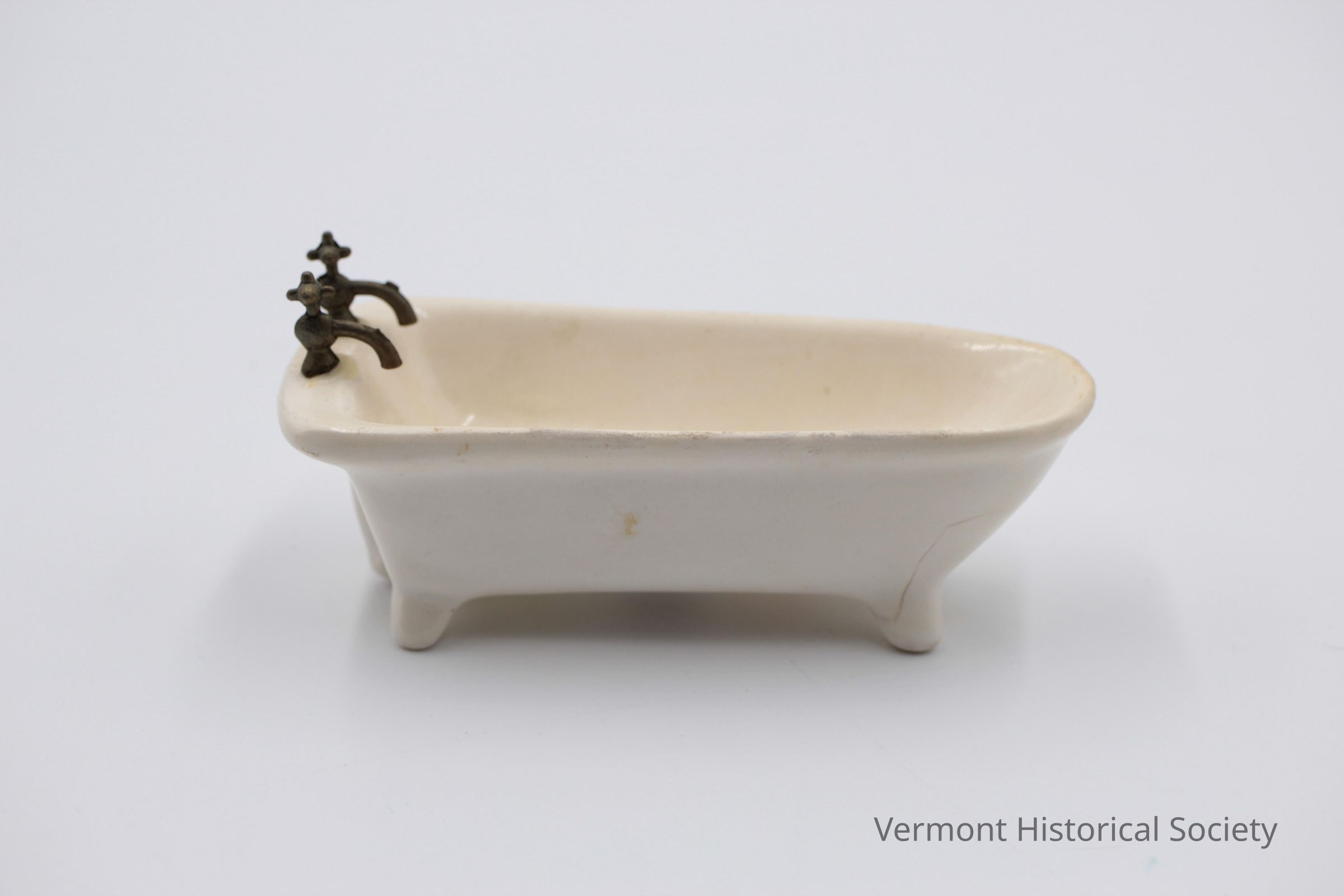 Miniature ceramic bathtub. The bathtub sits off the floor on four feet and there are two silver-toned metal faucets. A hole is molded into the bottom, showing that the tub is hollow. A gold sticker on the bottom reads, "Price Import / Taiwan / Republic of China".Context