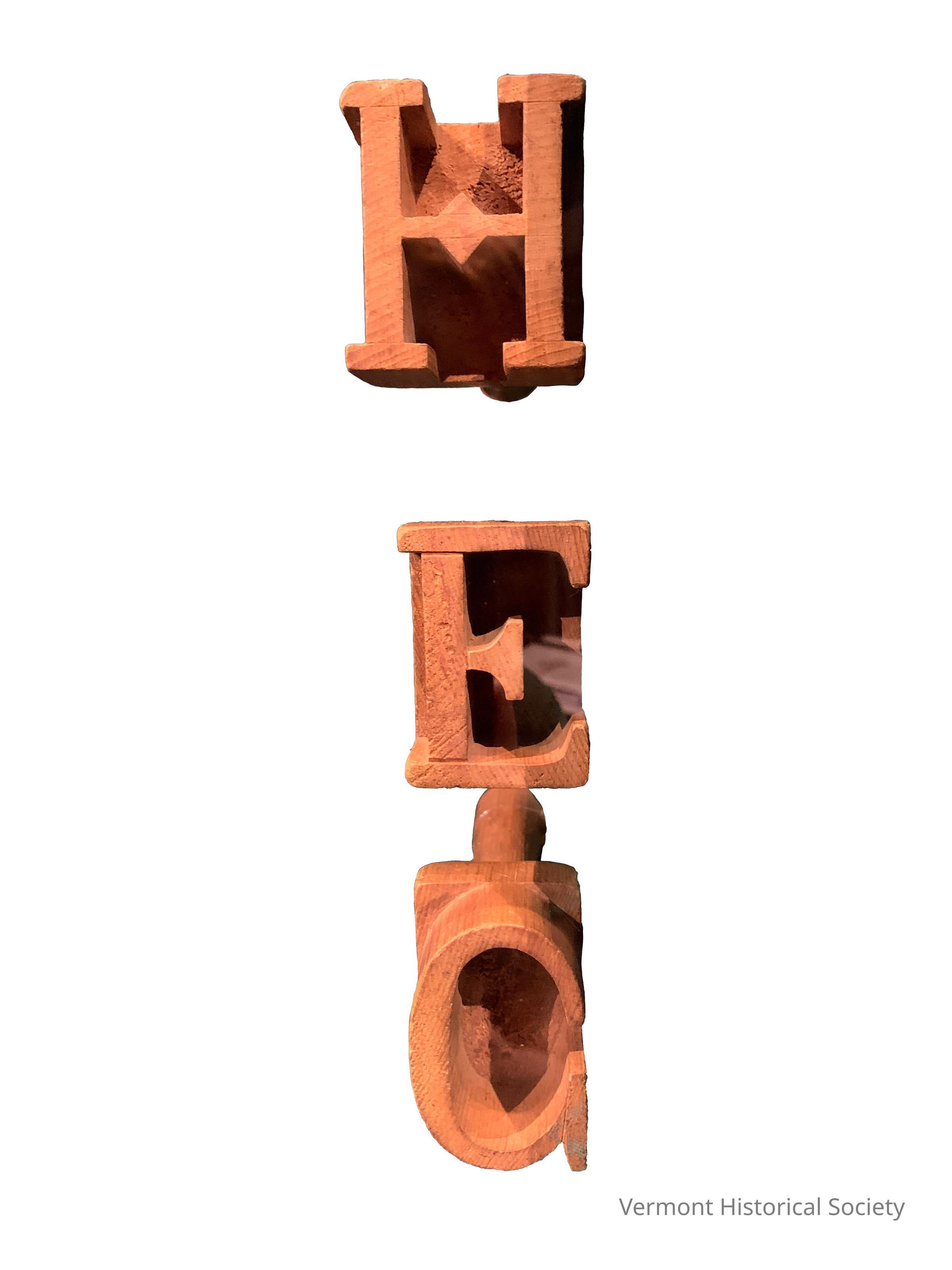 Three wooden brands carved into the letters H, E, and G. The handles are cut with the mark, "H B Lord". They appear to be unused.