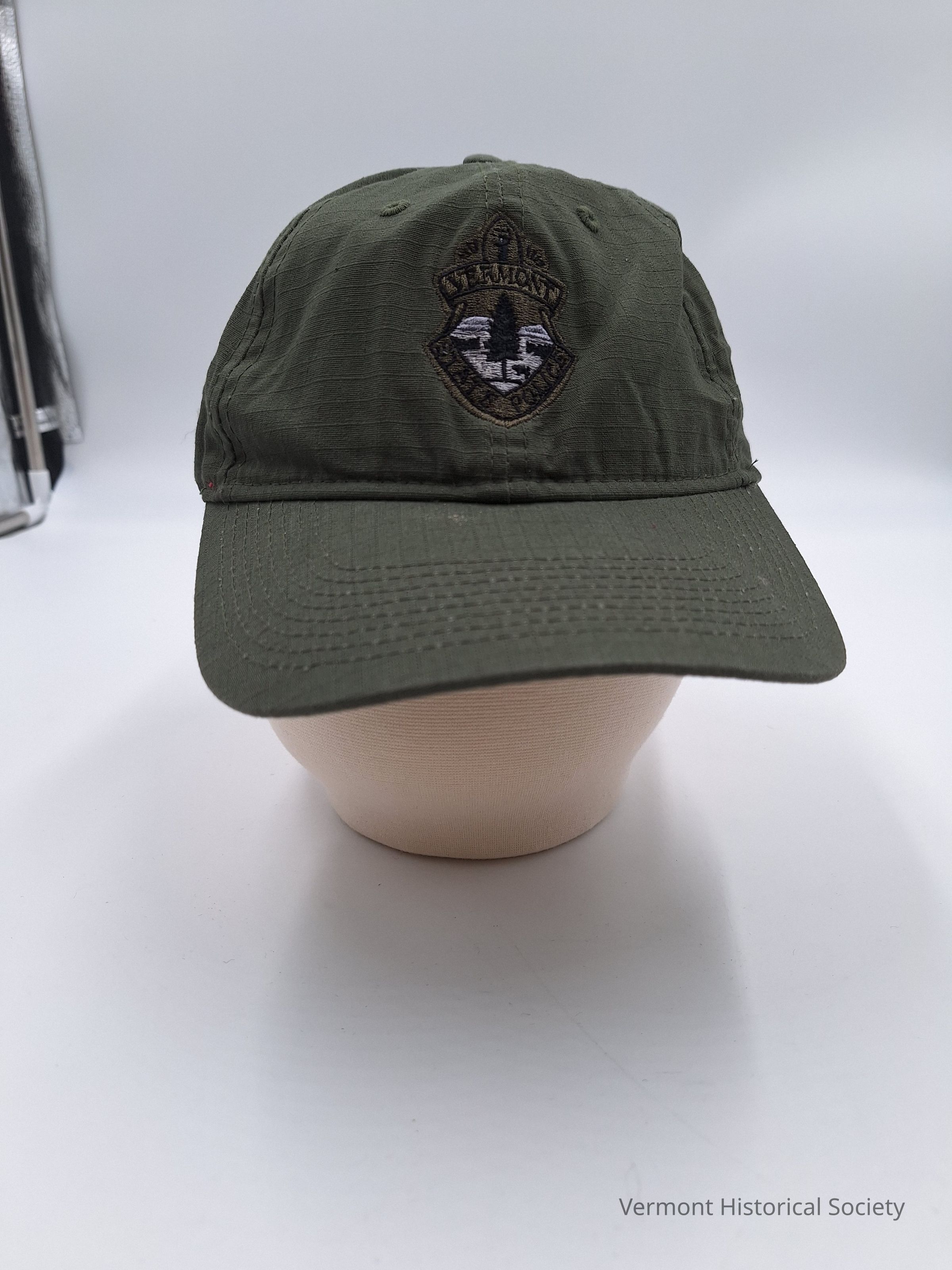 Olive green baseball hat. The hat features an embroidered logo on the front that reads "VERMONT STATE POLICE" in a banner around the edges for the shield-shaped image with a stag at the top and a central image of a tree in a mountainous landscape at the center. Around the arched opening at the back of the hat is embroidered "MARINE DIVISION" in black. There is a metal buckle fabric band to adjust the size of the hat for the wearer's head.Context