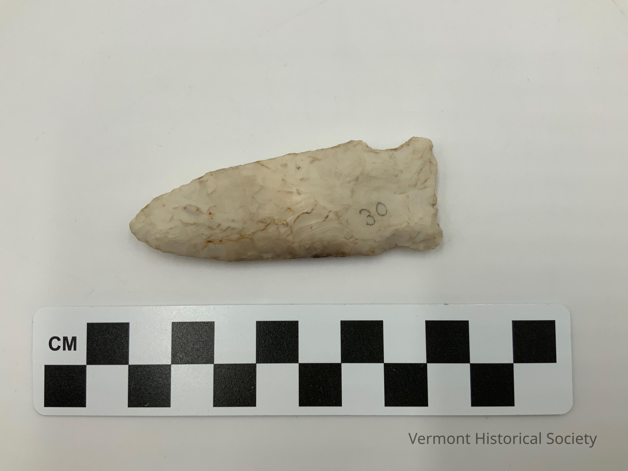 White chipped stone projectile point with side notches.