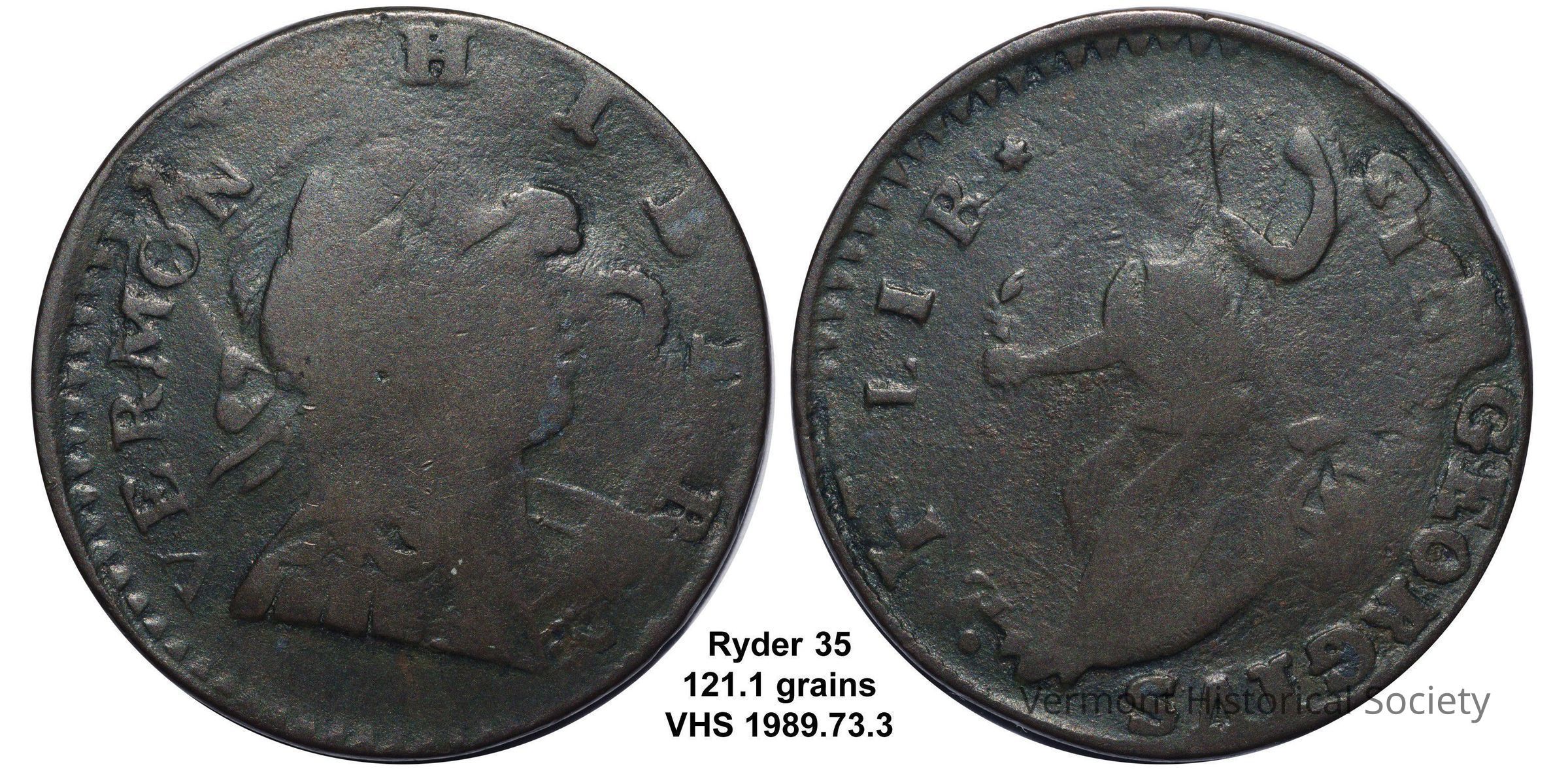 Copper coin with a bust on one side and the allegorical figure, Columbia, on the other. The face side shows a right-facing bust of a Roman figure, wearing a laurel wreath on his head, tied with a ribbon at the nape of his neck, and military armor. The words "VERMONT AUCTORI" ring the edge. A flaw in the coin mast it appear as if the bust is wearing a sweatband or blindfold. On the reverse, Columbia is shown swathed in loose fabric, seated next to a shield bearing the Union flag. She is holding a staff with a liberty cap in her left hand, and a small branch in her right hand. The words, "INDE ET LIB GEORGIVS" ring the edge.Context