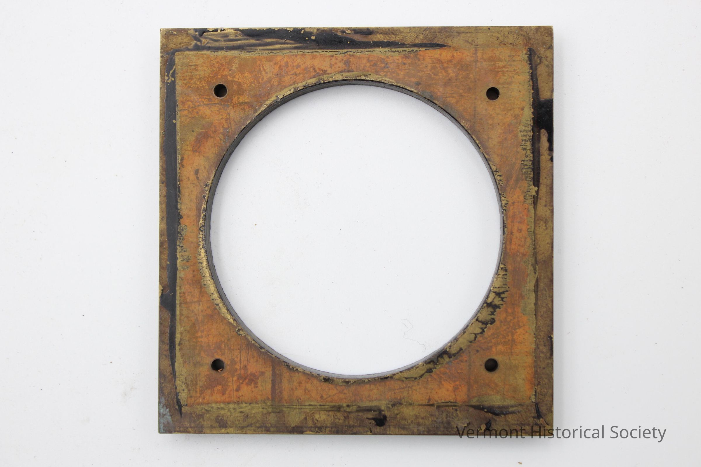 Square metal bracket with a large, round central hole.