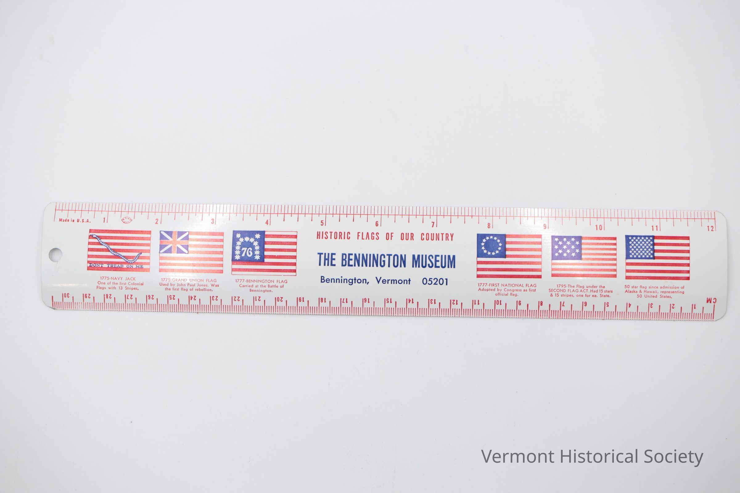 A white metal ruler featuring six historic, American flags. The ruler has inches marked in red on one side and metric measures in red on the other. In the center, it says, "The Bennington Museum, Bennington, Vermont, 05201" in blue letters.Context