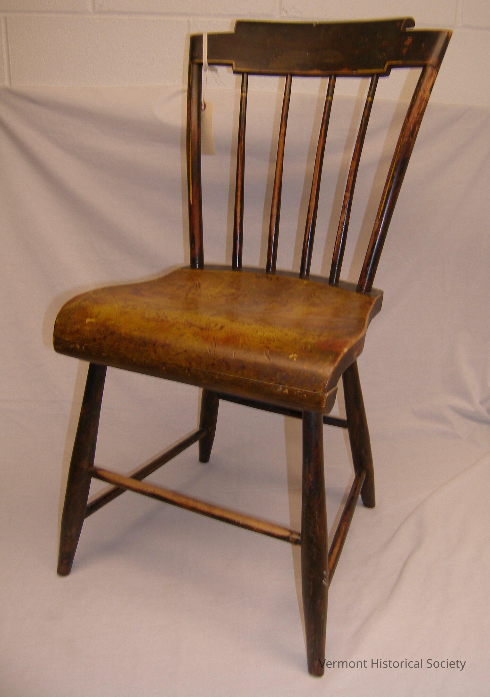Yellow grain painted windsor chair with a scrolled seat. The crest rail is stenciled with a fruit basket design (now faded). The chair is sponge painted in imitation of curly maple.